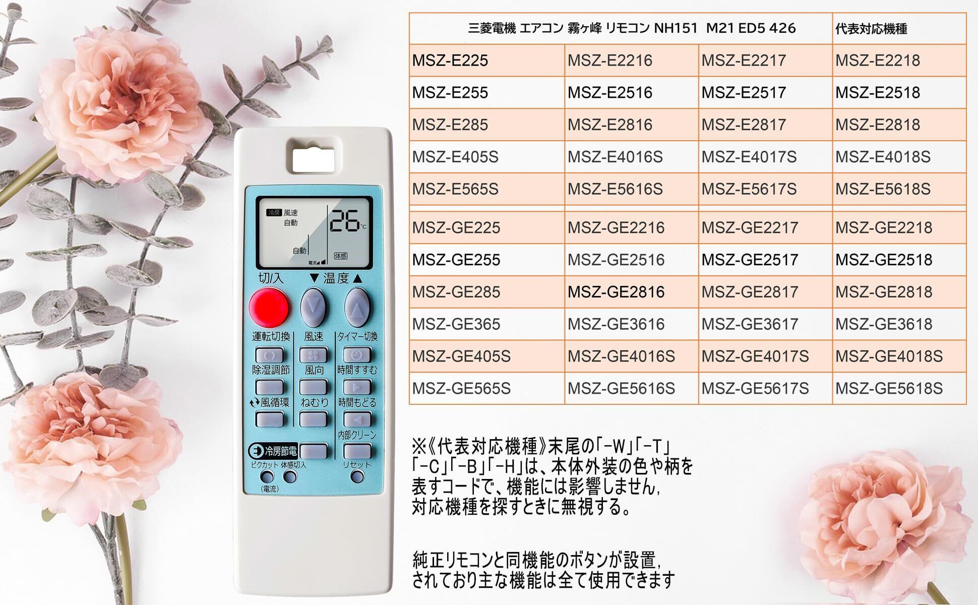 ◆ この エアコン 三菱 霧ヶ峰 リモコン 汎用 「 リモコン」です,対応リモコン品番: NH151 / M21ED5426 ,適用機種:MSZ-E225 MSZ-E255 MSZ-E285 MSZ-E405S MSZ-E565S MSZ-E2216 MSZ-E2516 MSZ-E2816 MSZ-E4016S MSZ-E5616S MSZ-GE2216 MSZ-E2217 MSZ-E2517 MSZ-E2817 MSZ-E4017S MSZ-E5617S MSZ-E2218 MSZ-E2518 MSZ-E2818 MSZ-E4018S MSZ-E5618S ,その他の対応エアコン機種については、表「代表的な対応機種」をご覧ください。 ※《代表対応機種》末尾の「-W」「-T」「-C」「-B」「-H」は、本体外装の色や柄を表すコードで、機能には影響しません,対応機種を探すときに無視する。