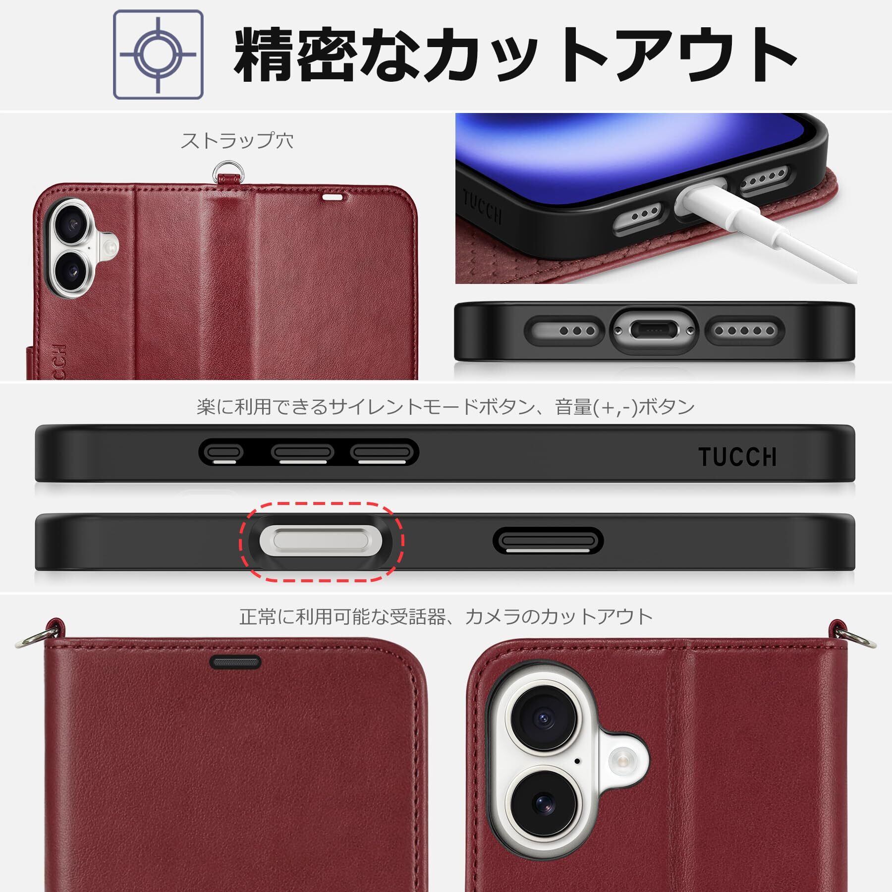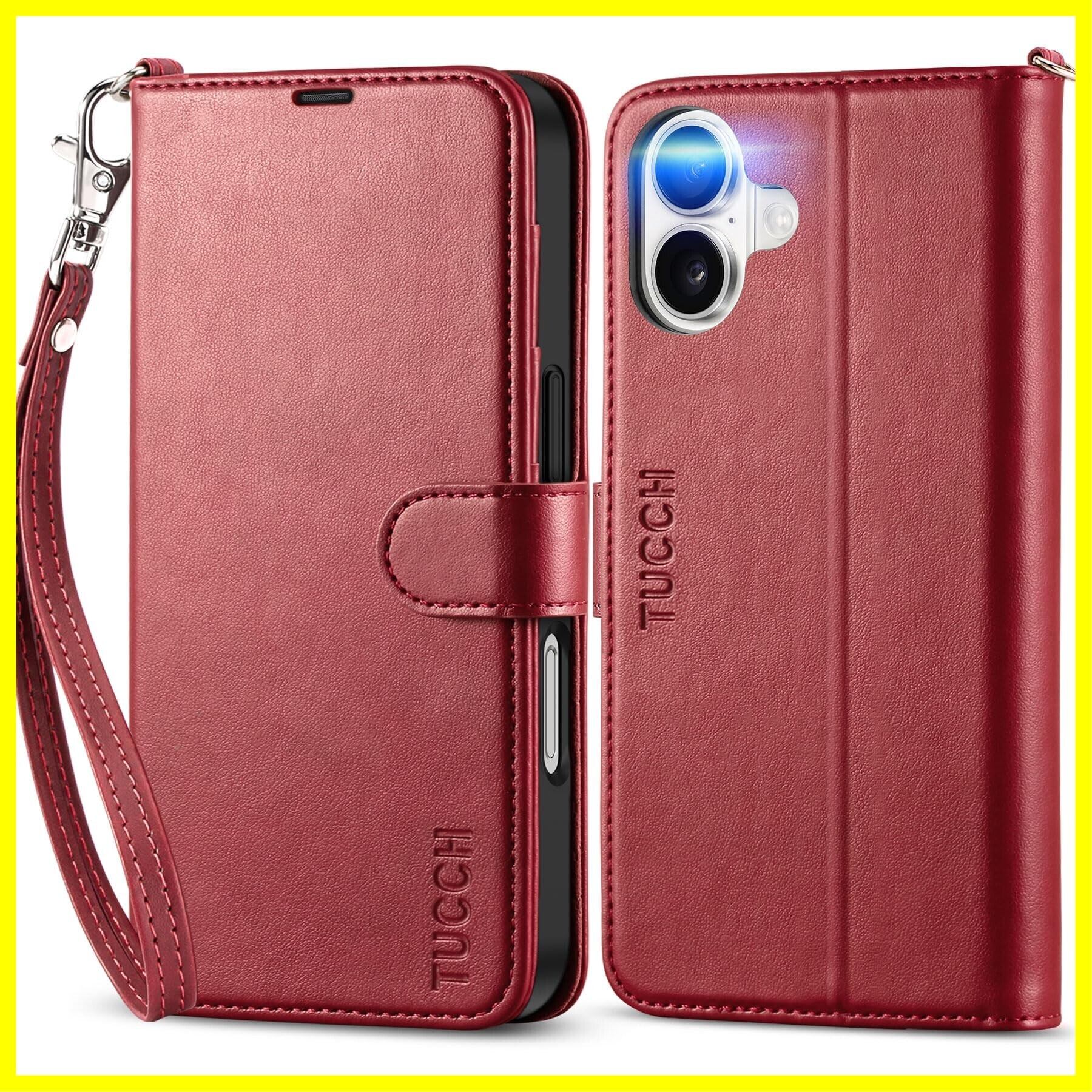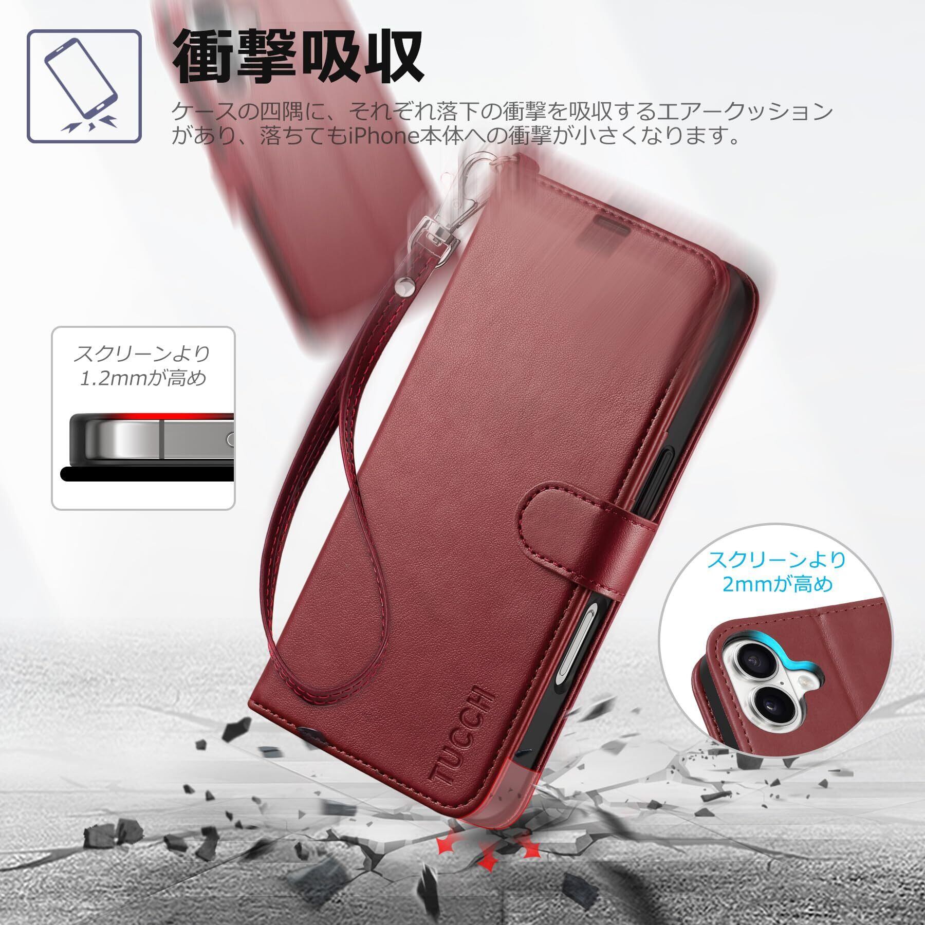 TUCCH iphone16 対応 ケース手帳型 ストラップ付き アイフォーン16手帳ケース 4つカードポケット付き [RFIDブロッキング] キックスタンド機能 TPU素材 PU合皮 全面保護 衝撃吸収 あいほん16カバー (2024年発売 6.1インチ iPhone 16 対応) ストラップ&ダークレッド