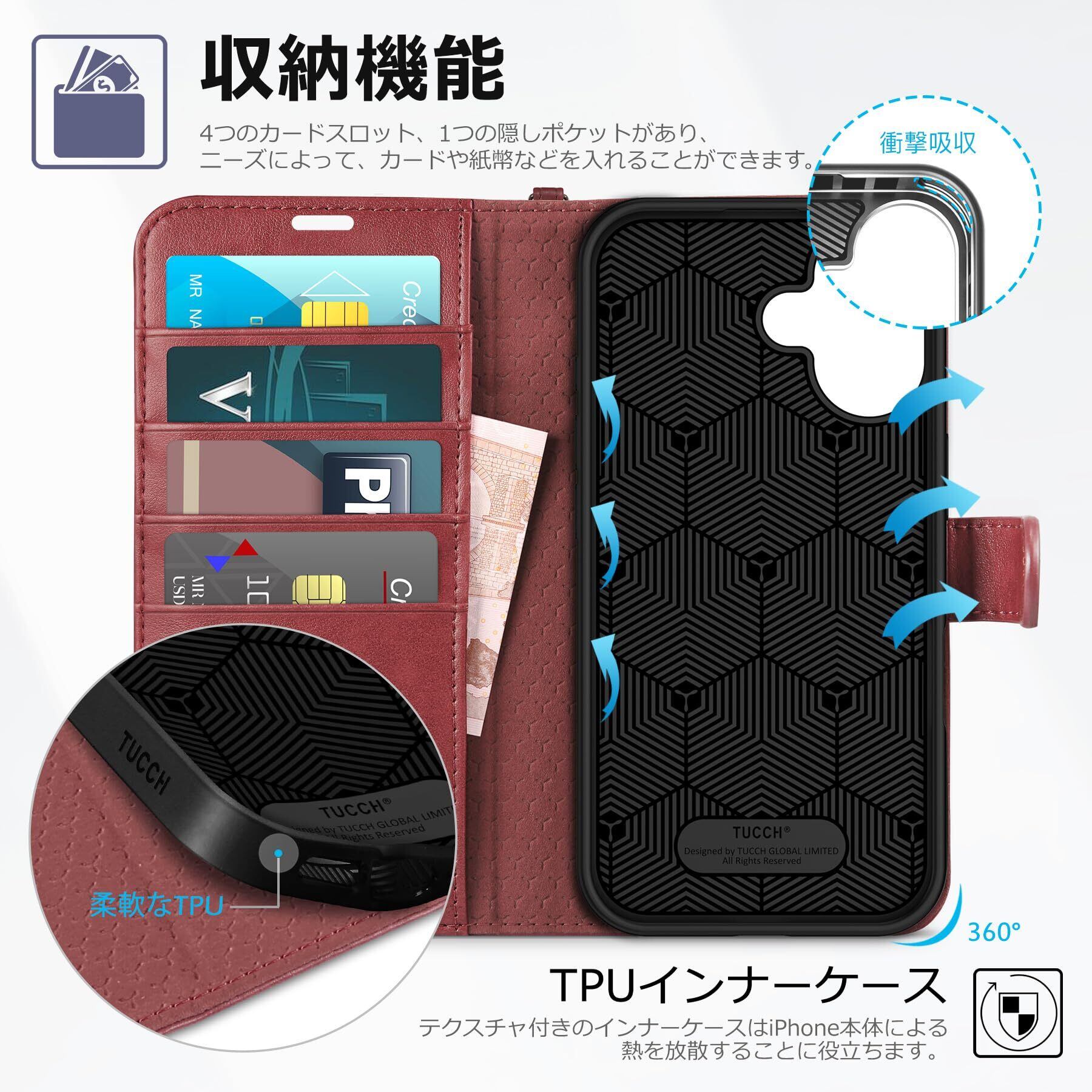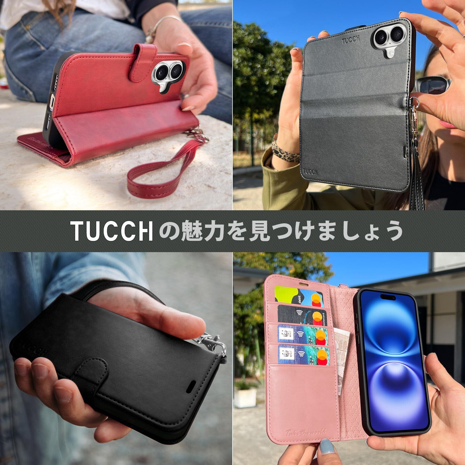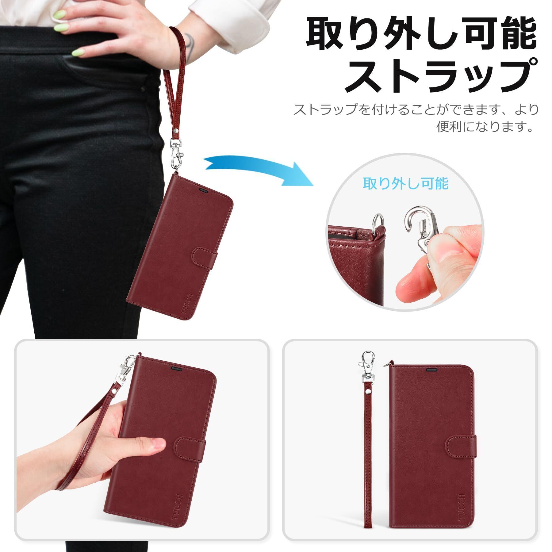 TUCCH iphone16 対応 ケース手帳型 ストラップ付き アイフォーン16手帳ケース 4つカードポケット付き [RFIDブロッキング] キックスタンド機能 TPU素材 PU合皮 全面保護 衝撃吸収 あいほん16カバー (2024年発売 6.1インチ iPhone 16 対応) ストラップ&ダークレッド