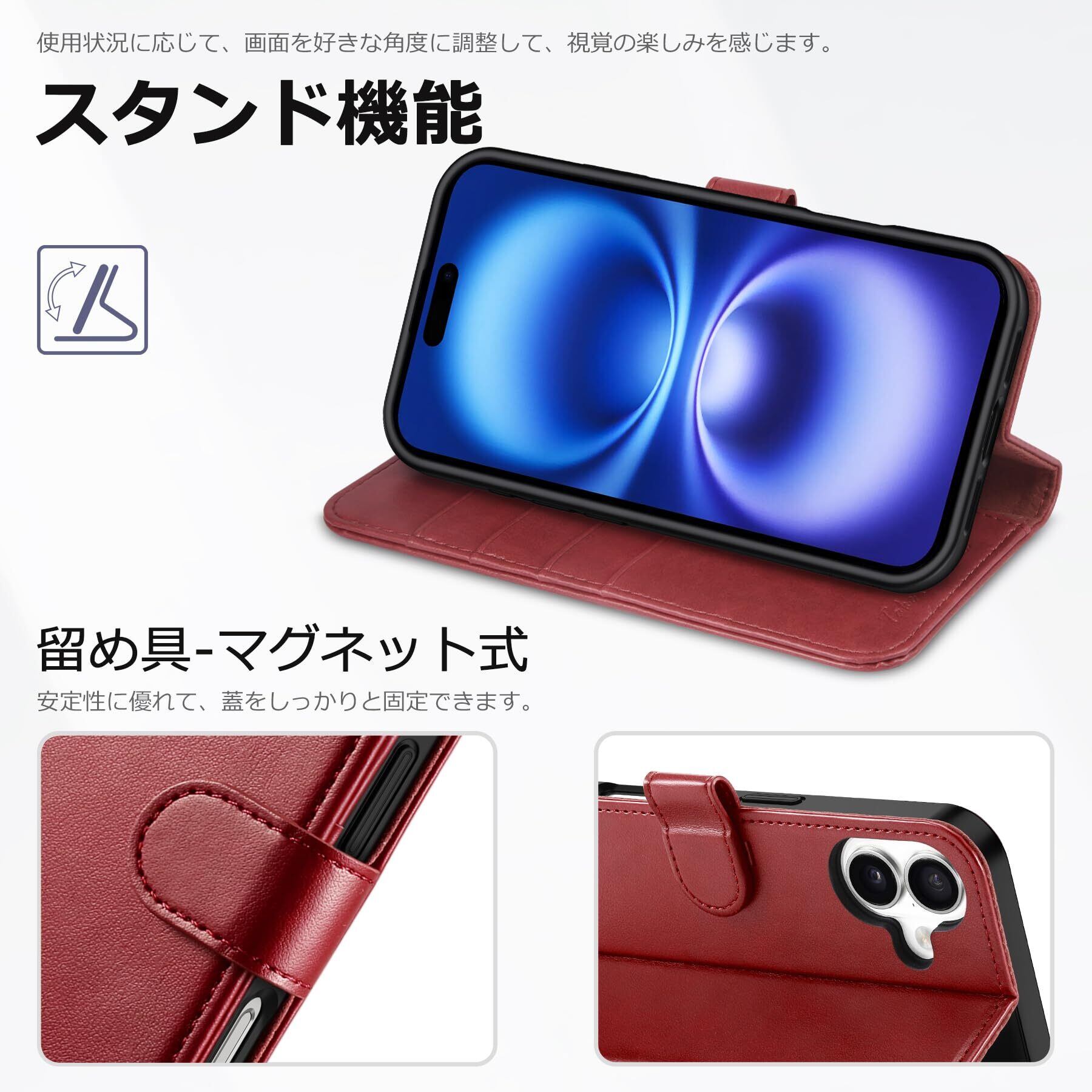 【対応機種】この手帳型ケースはただ2024年発売6.1インチのiPhone16にのみ対応します、他の機種は対応しません。ご注意:同じ6.1インチですけど、各機種のサイドボタン、カメラの位置は少しズレてしまう可能性があるため、ケースを選んで買う時、ご携帯の機種を十分ご確認の上、ご注文頂きますようお願い申し上げます。