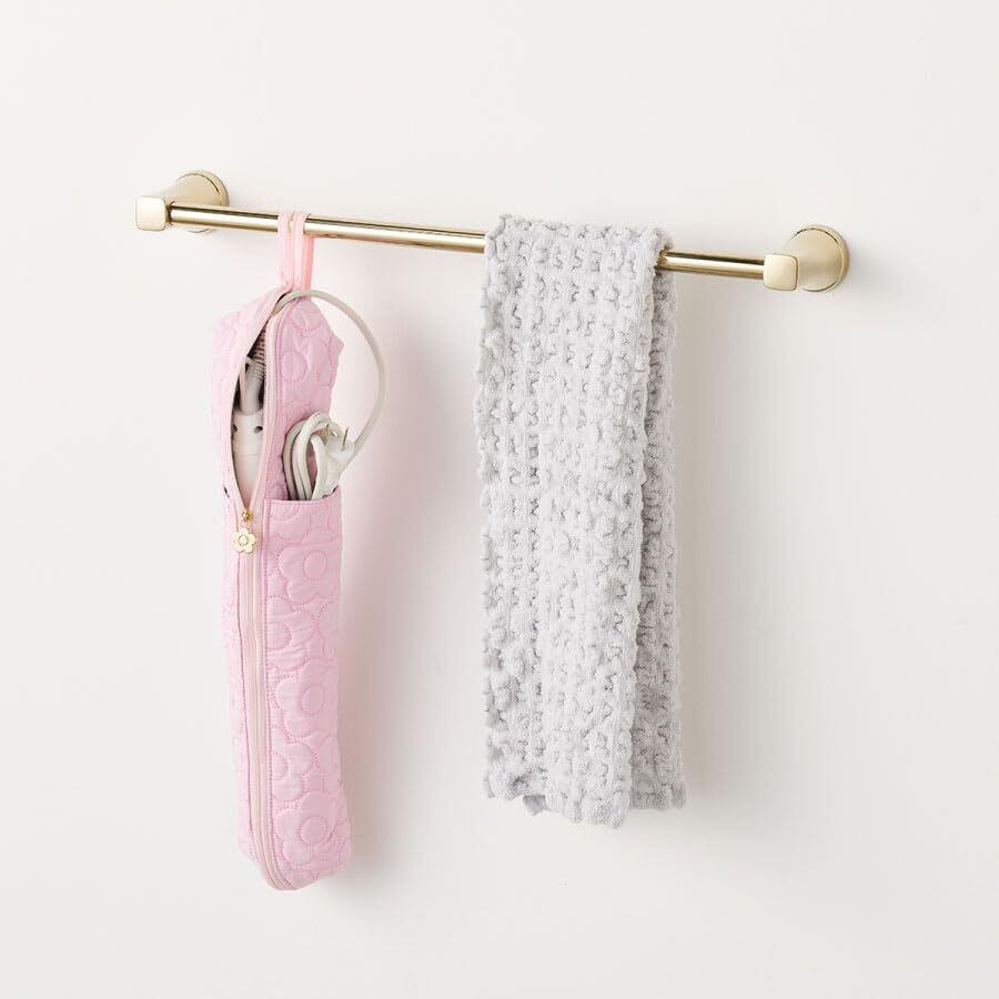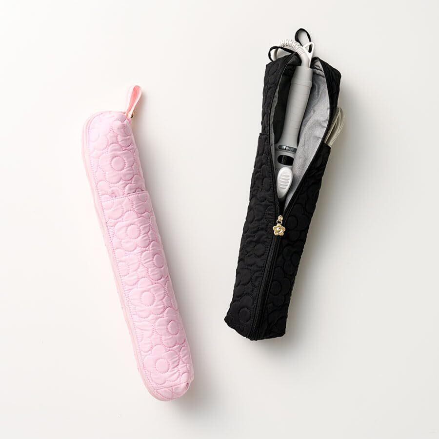 内生地が耐熱なので、ヘアアイロンやコテを熱いまま収納できるケースです。 タオルバーにも掛けられるので旅先はもちろん、自宅用としても使えます。 キルティングの総柄デイジーとゴールドのファスナーヘッドがかわいい便利なアイテムです。※ヘアアイロンは付属しておりません。