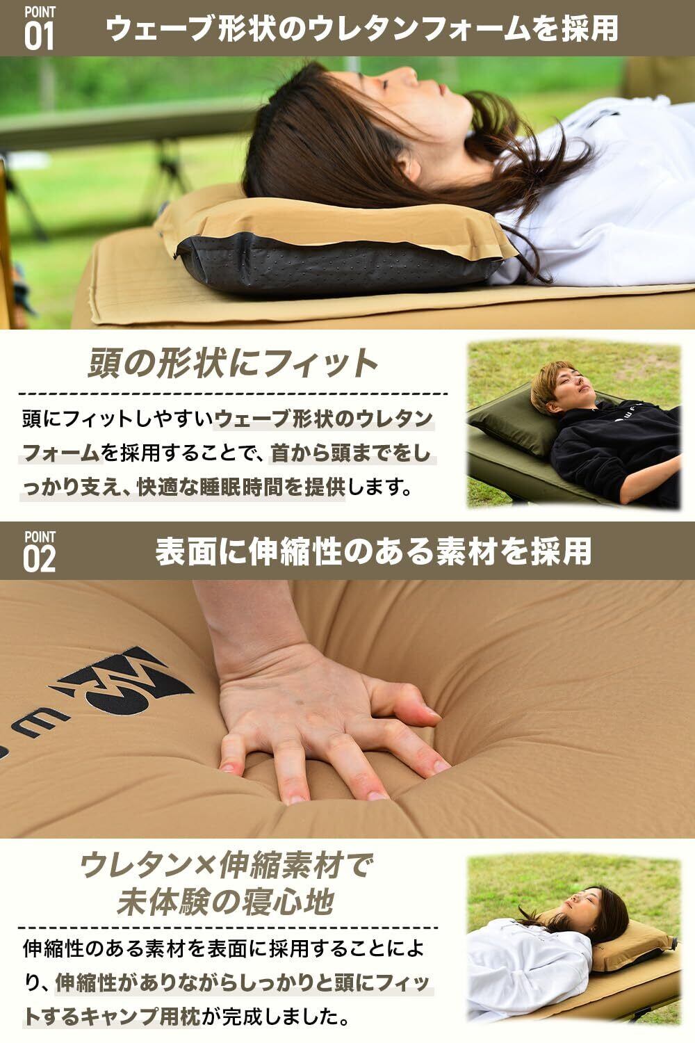 人気のアウトドアブランド【WAQ】から快適な睡眠をサポートする 車中泊・キャンプマットが登場!アウトドアに必需品のまくら です!【キャンプでも睡眠を妥協したくないあなたへ】クッション素材には弾力性に優れているウレタンを使用。エアーによるマットの張りを損なわずウレタンの気持ちいい弾力を実現!【丸洗い可能なシーツが付属】汗をかきやすい頭を支える枕には専用のシーツが標準装備!マット用シーツと同様に丸洗い可能なためいつでも清潔な状態でご使用いただけます。【厚みたっぷりのウレタン】最大7cmの極厚ウレタンがあなたの頭をしっかりサポート。弾力性のある生地と相まって寝心地が更に向上いたしました。【自動膨張】バルブを開くと自動で空気が入ります!さらに高機能バルブを搭載した事で空気の逆流を防ぎ、より効率よく空気を取り込むことが可能に。 ※初回空気入れ時は出荷状態のため空気の入りが遅くなります。