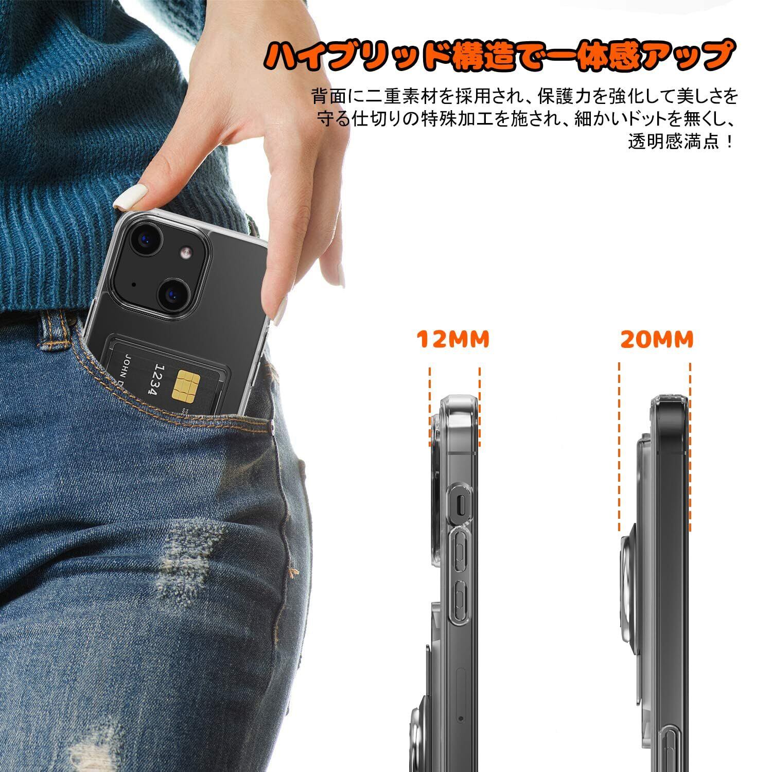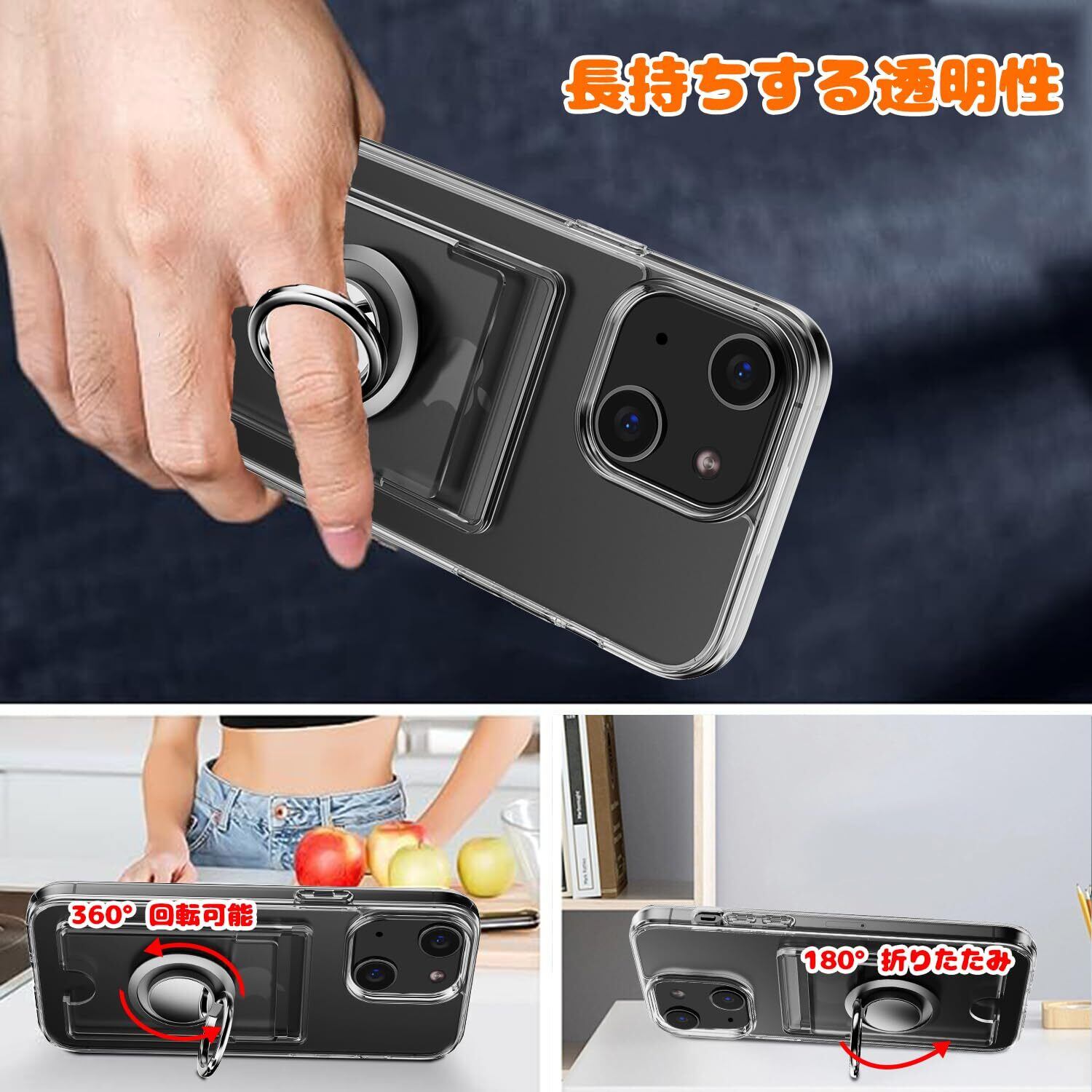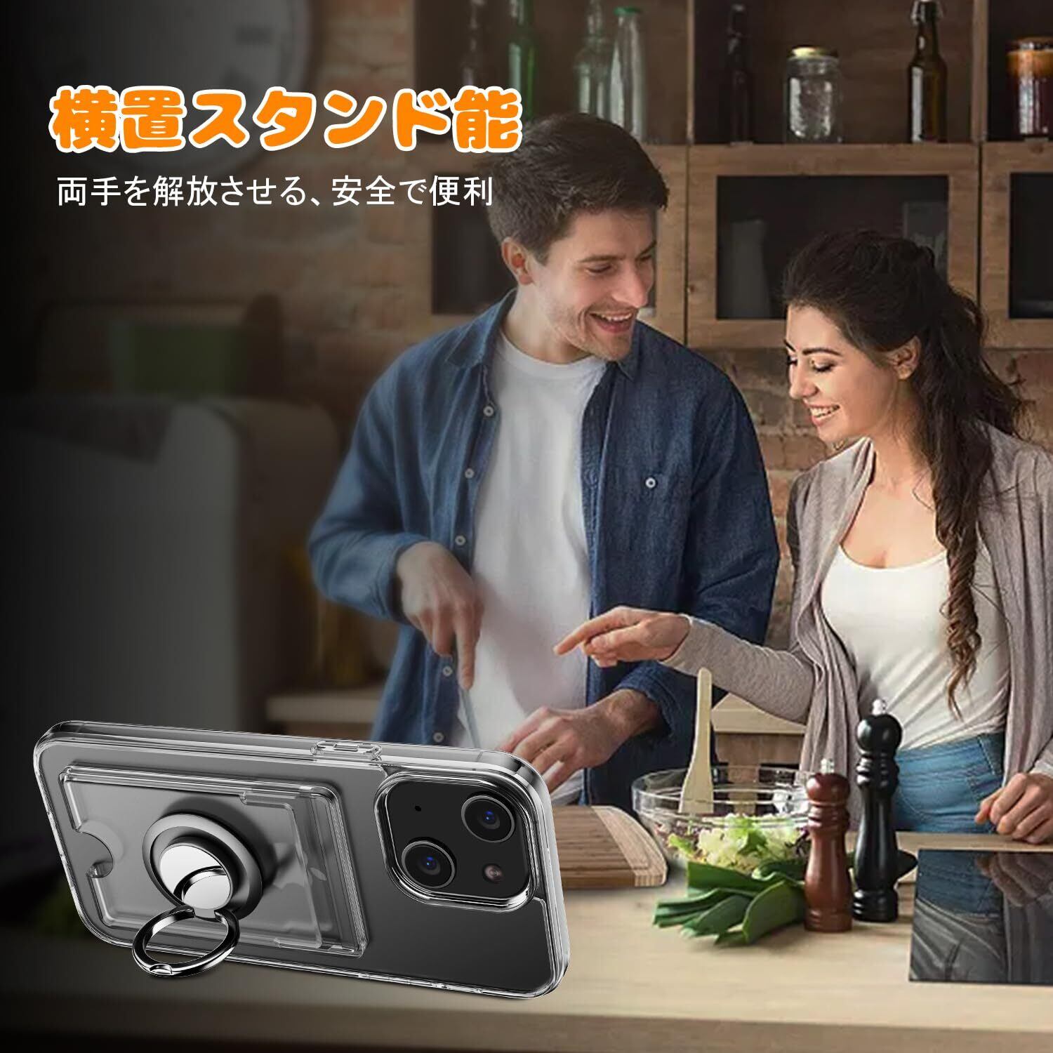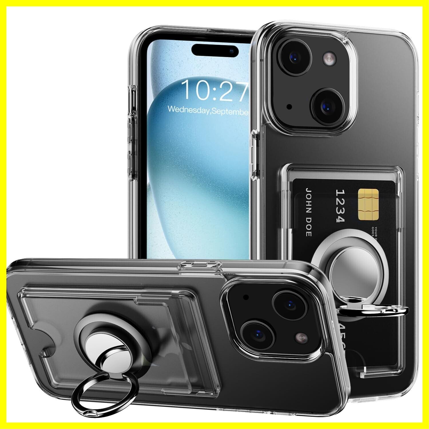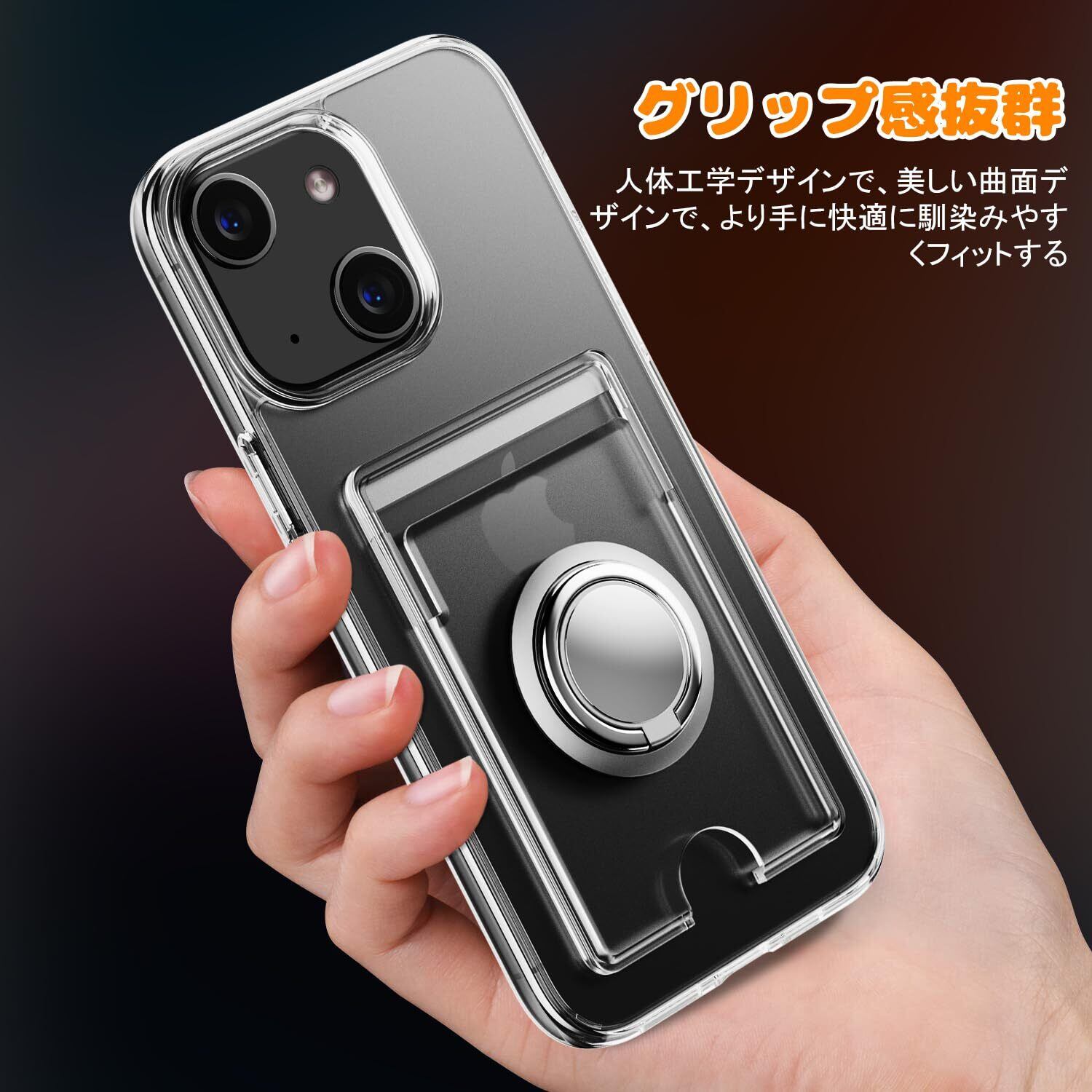 対応 iPhone 15 ケース 透明 カード収納 リング付き 耐衝撃保護カバー アイフォン15 スマホケース クリア シリコン スタンド機能 耐久 滑り止め (クリア)