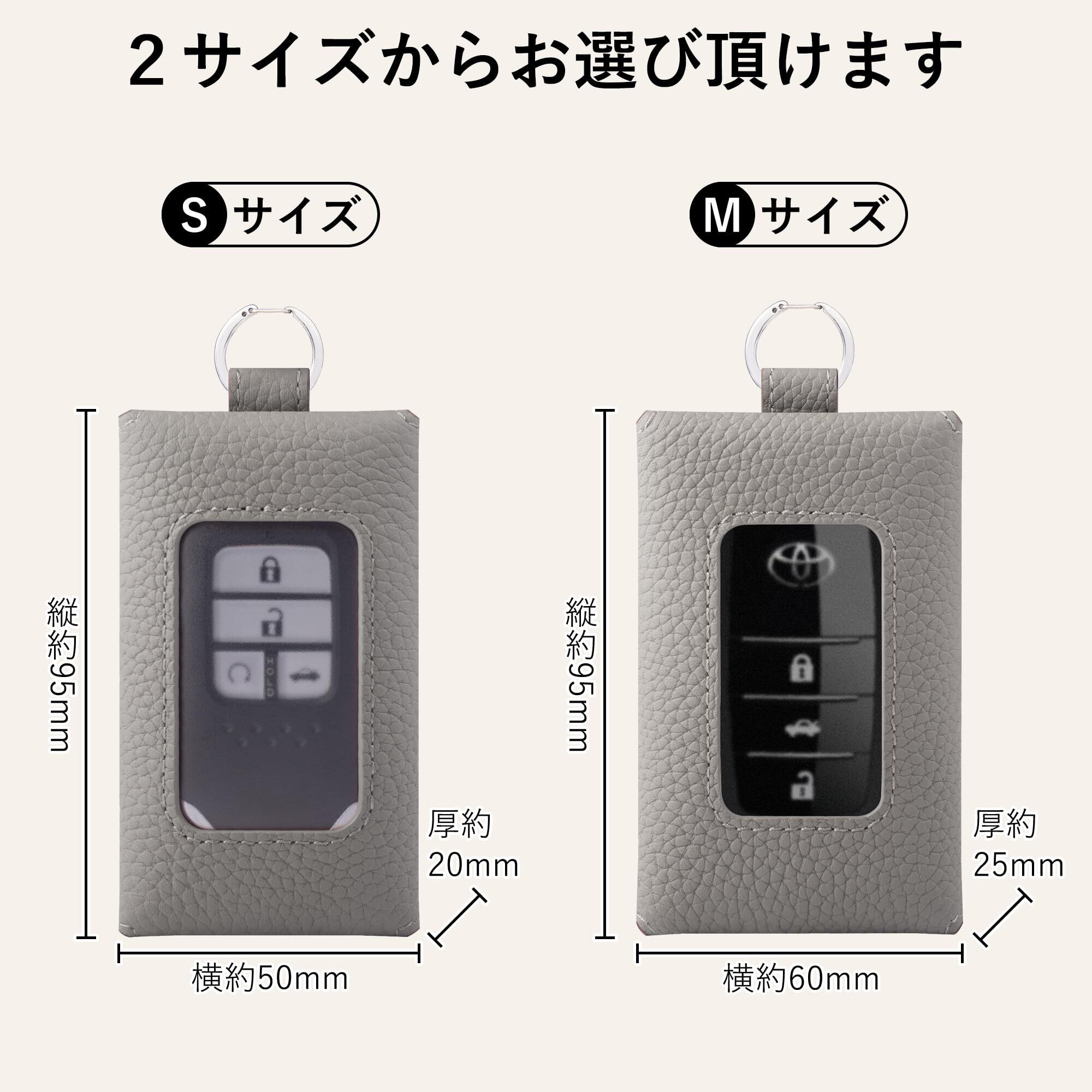 窓が付いた収納ポケットで、スマートキーを収納したままでも操作が可能なため、非常に便利です。Sサイズ:スマートキーの縦は約80mm、外周は約100mm(横40mm×厚さ10mm)、Mサイズ:スマートキーの縦は約80mm、外周は約120mm(横45mm×厚さ15mm)まで収納できます。