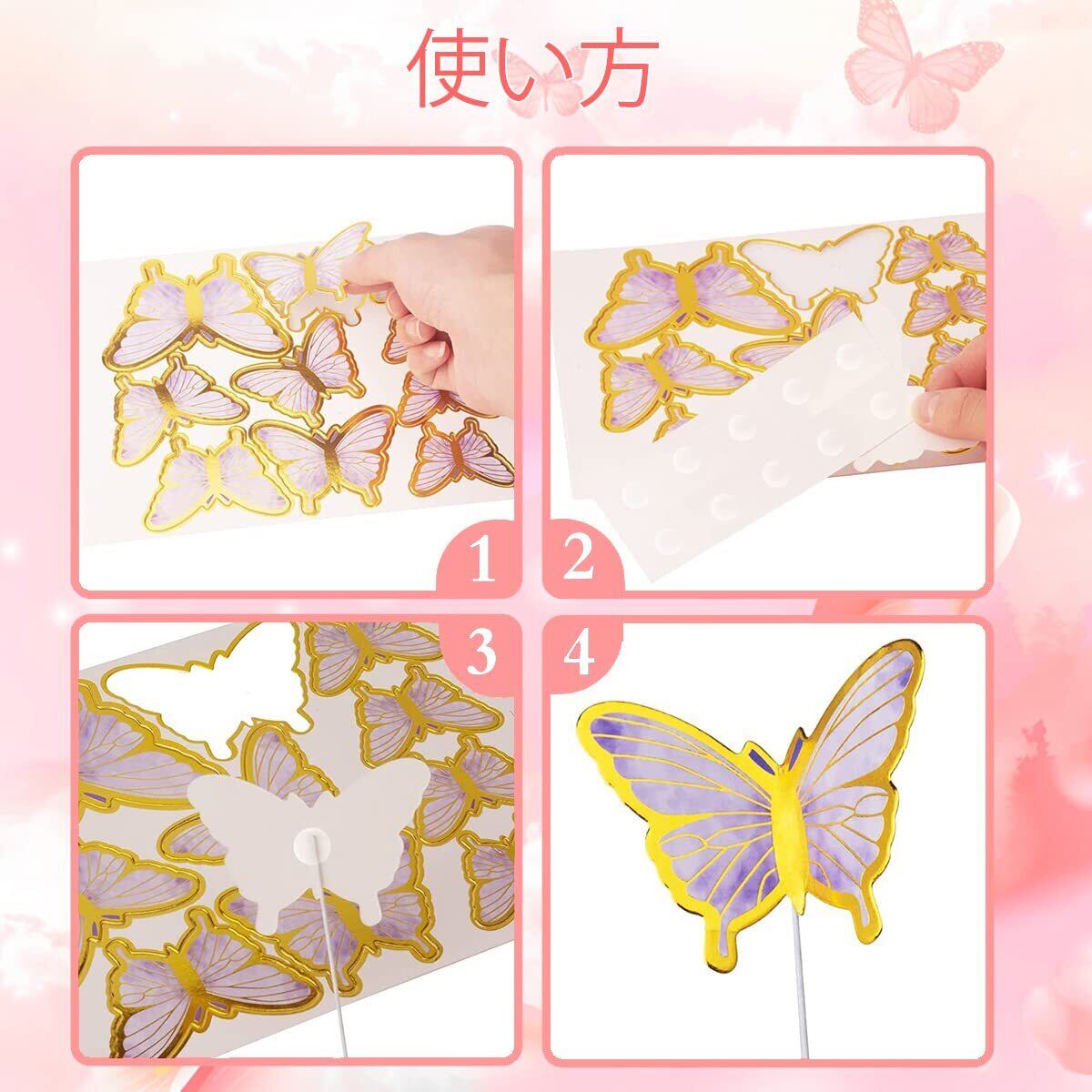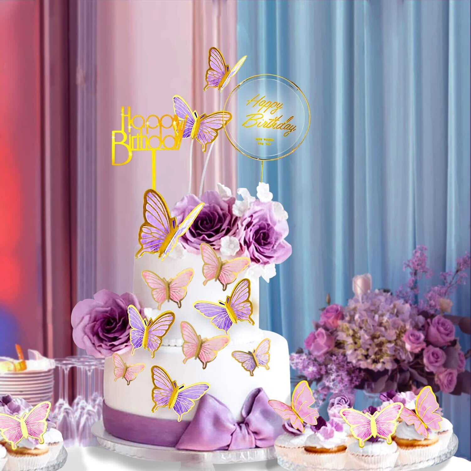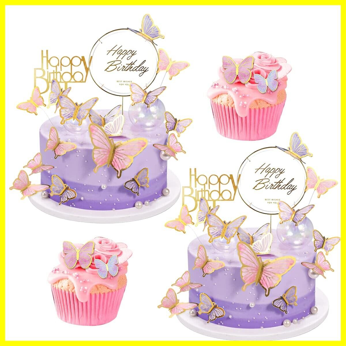 【デザイン】蝶のケーキトッパーデコレーション、ピンクとパープルが優しくて美しい、ケーキの装飾はとてもリアルで、まるで本物の蝶がケーキの上を飛んでいるように見えます。