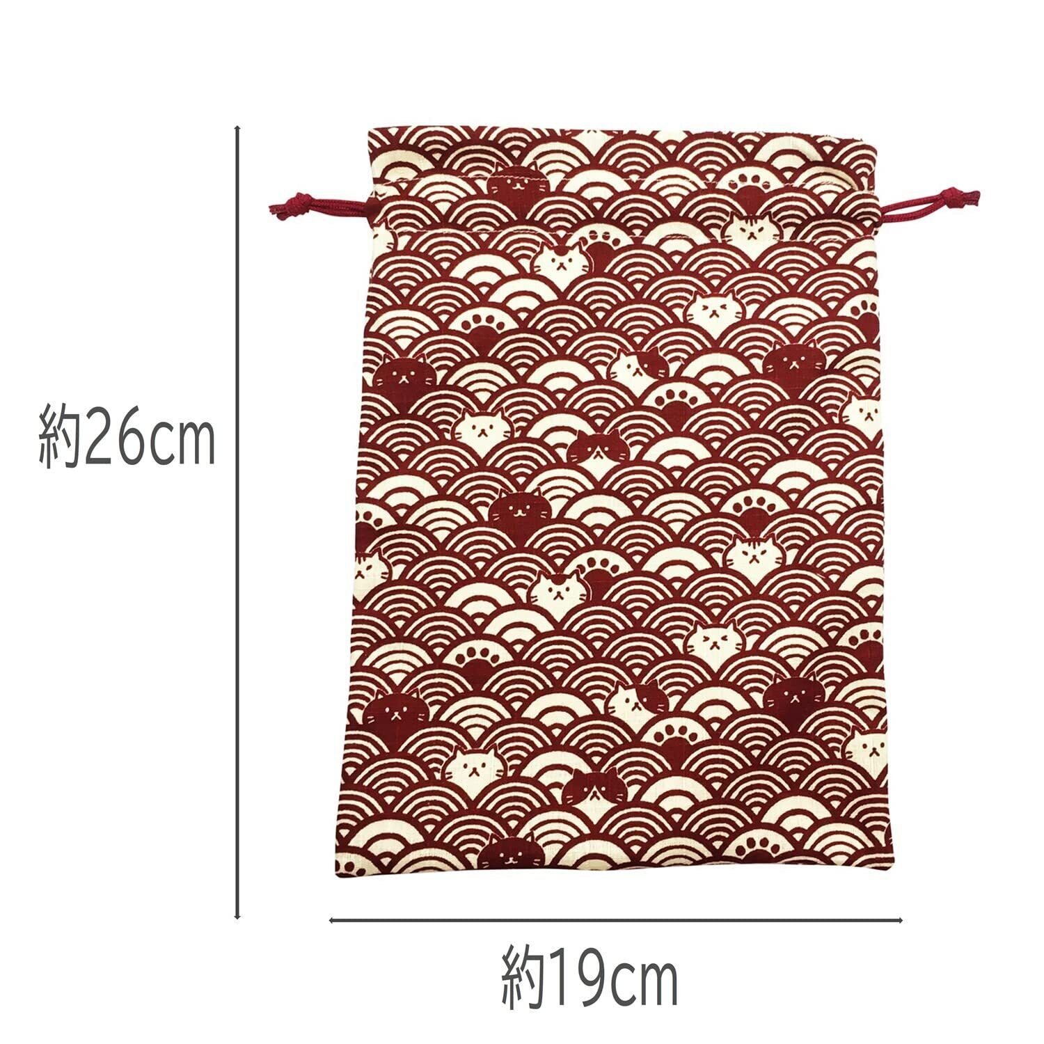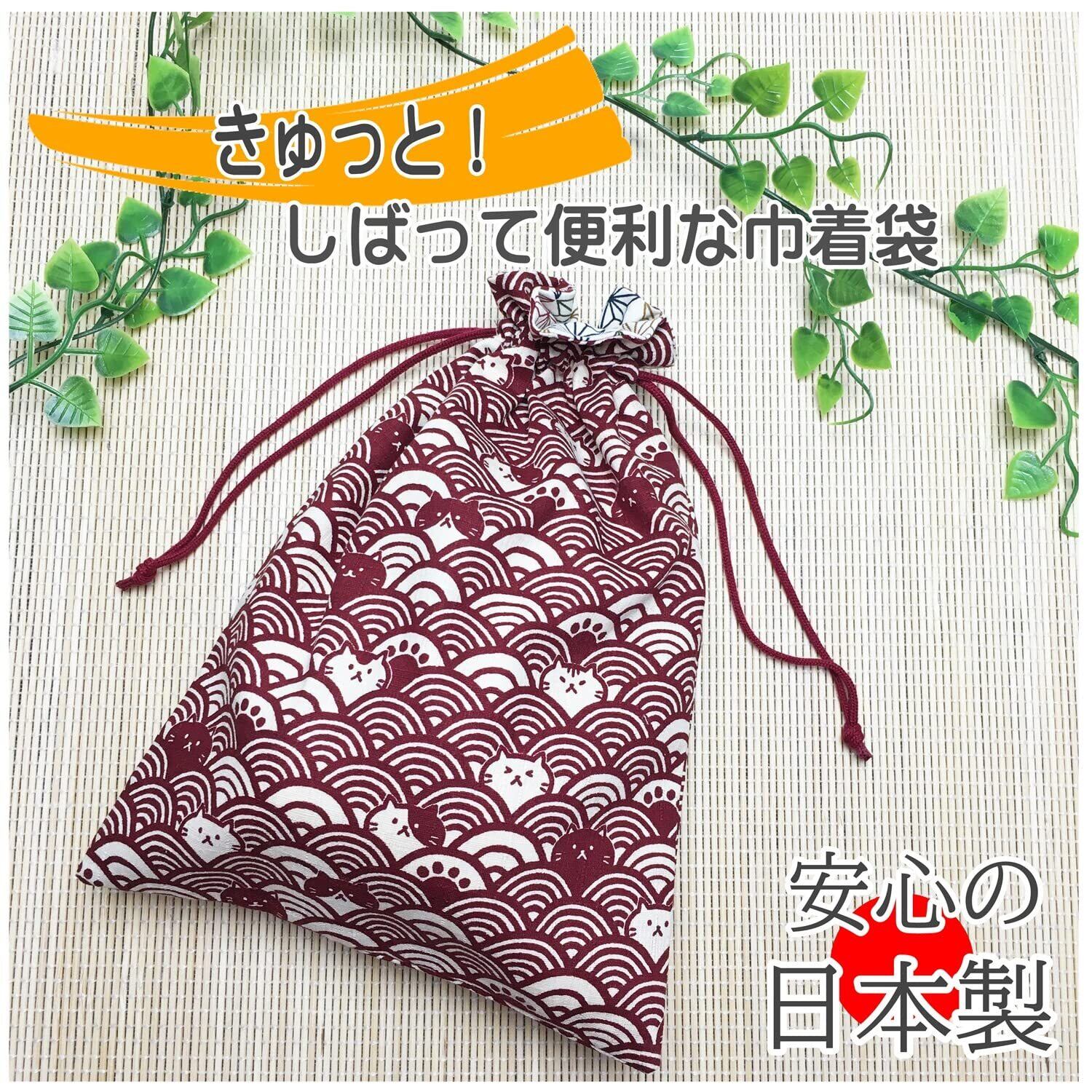 巾着 御朱印帳入れ 日本製 小物入れ 裏地付 猫柄 和雑貨 和柄 巾着袋 ki-155 (01 青海波ネコ エンジ)