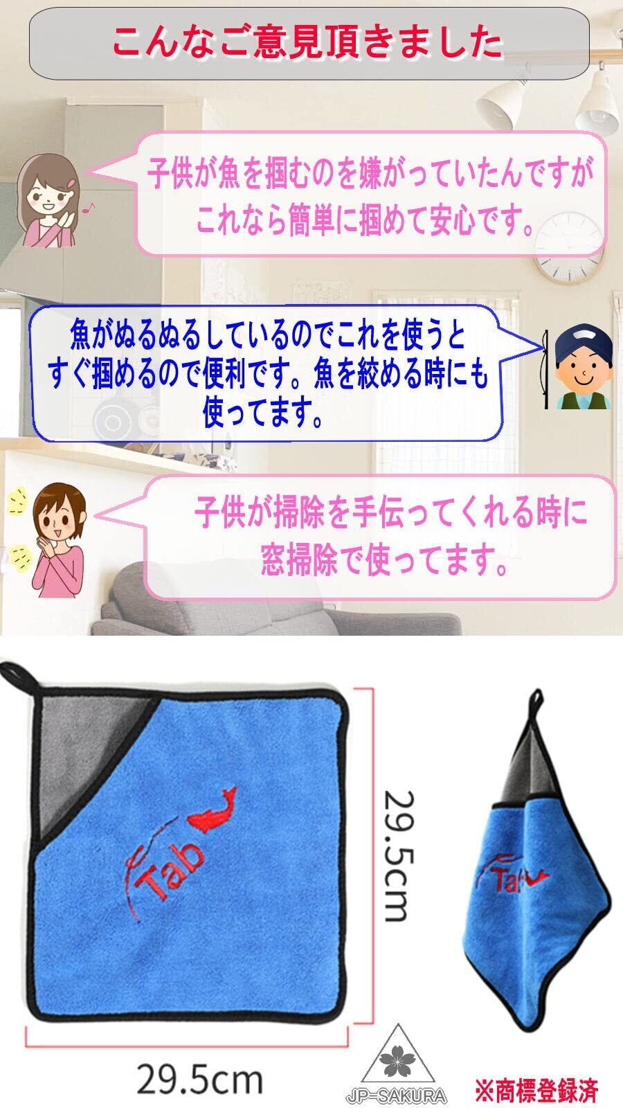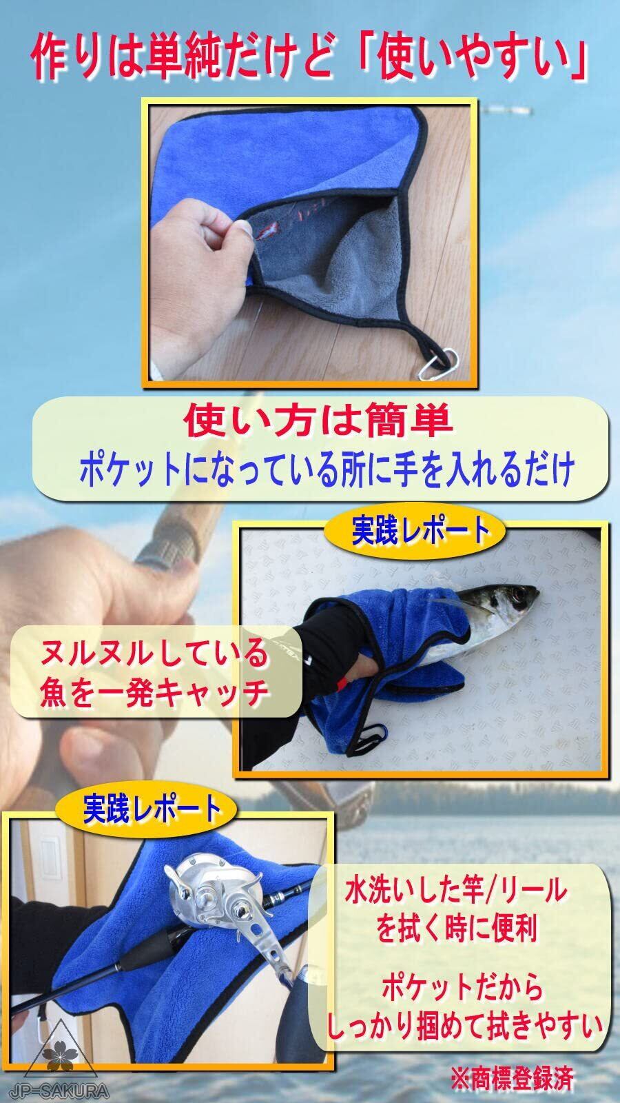 魚つかみ 釣り竿拭き タオルになります。使い方は簡単でポケットに手を入れて使うだけです。ヌルヌルした魚もすぐ掴めます。手で直接魚を触らないので魚臭さもかなり軽減されます。使いやすいのでお子様にも人気です。 その他にも、海から帰ってきて水洗いした後の竿や道具を拭いたりするにも使用できます。厚みがしっかりあるので吸水力も抜群。こういう使い方もできますって意見頂いてます。キャンプの小道具として、車拭き、窓掃除、ゴルフのお手入れ、シャンプー後のペットの体拭き