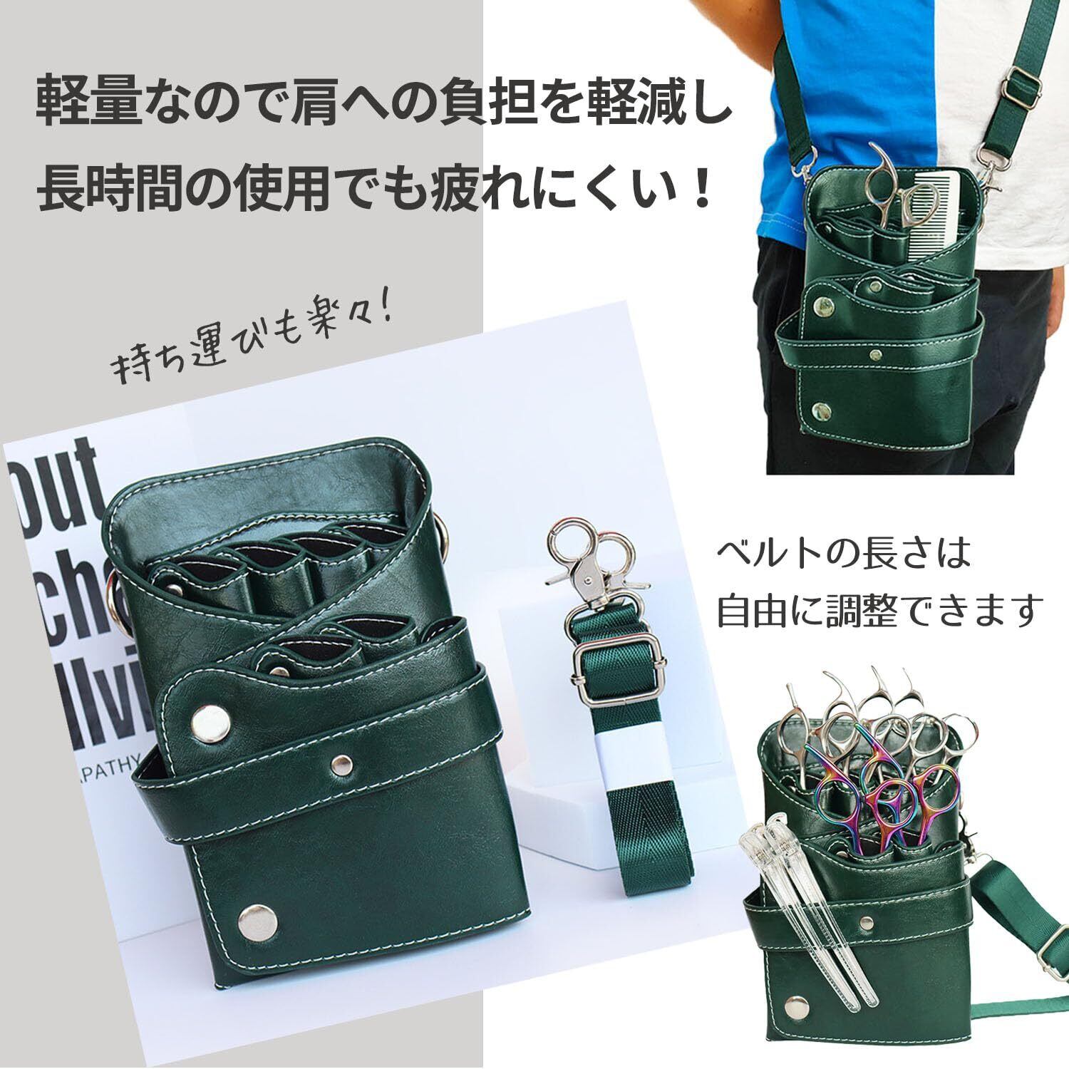 【商品仕様】商品内容:シザーケース1個。カラー:ブラック、グリーン、ブルー、ブラウン、レッド。サイズ:縦20cm、横14cm、厚み4cm、ベルトの長さ約133cm。重量:約230g(サイズにおきまして個体差や計測の仕方で多少の誤差がある場合がございます)。モニターなど環境により画像と若干見え方が違う場合がございます。