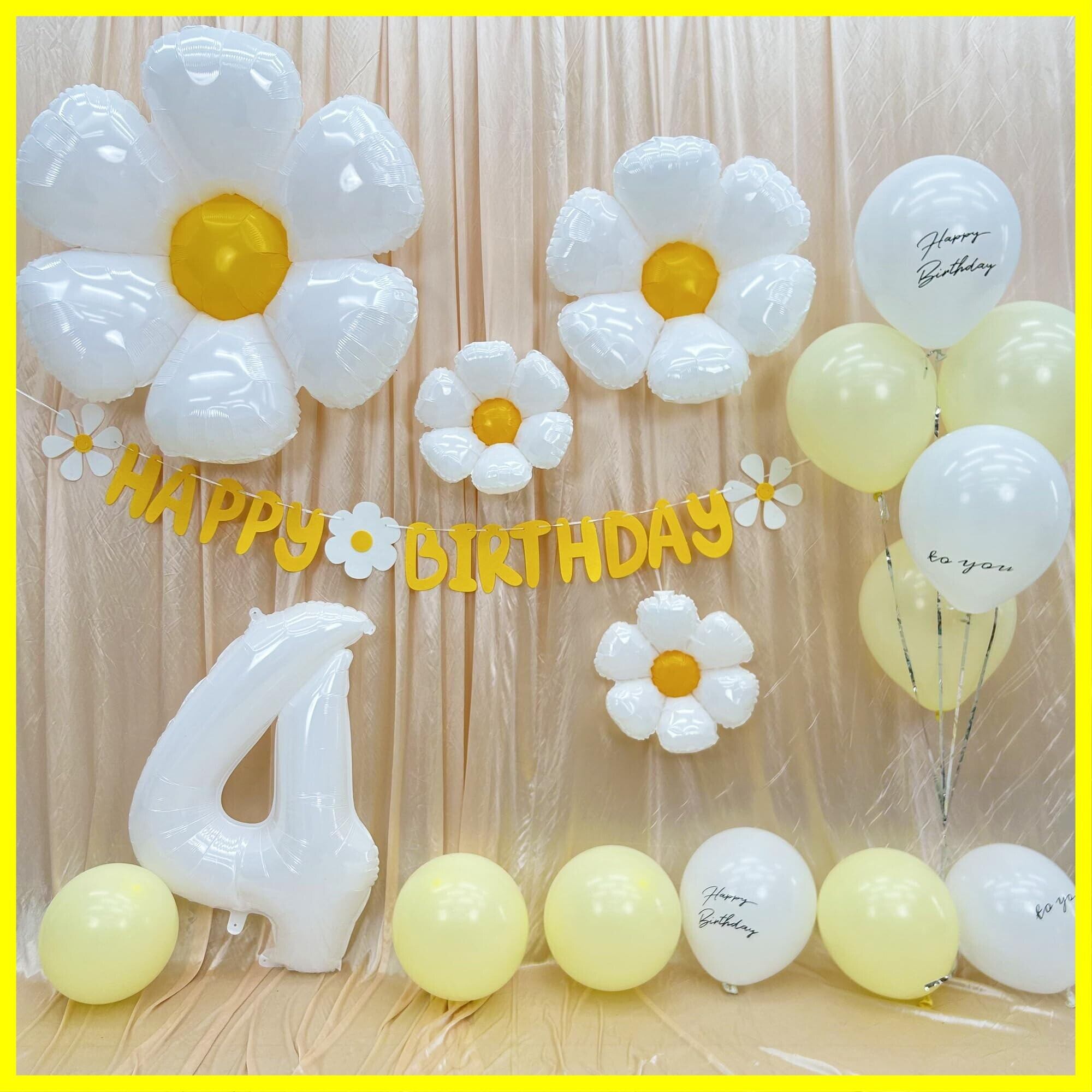 セット内容 - ゴム風船×8(HAPPY BIRTHDAY × 2、TO YOU × 2、うすい黄色× 4)、フェルト布ガーランド×1組、デイジーバルーン ×4、数字バルーン×1、リボンひも (10m)、両面テープ [ゴム風船専用]。