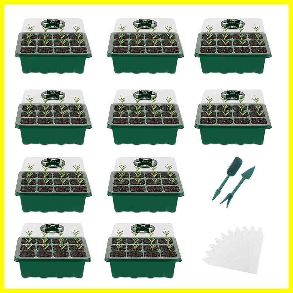 【10セット】 育苗ポット 育苗トレイ 12穴育苗 ホワイトラベル10個+移植ツール2個 園芸用品 種まきハウス 種まき器 透明カバー 育苗ボックス 野菜栽培 苗トレーに適しています…