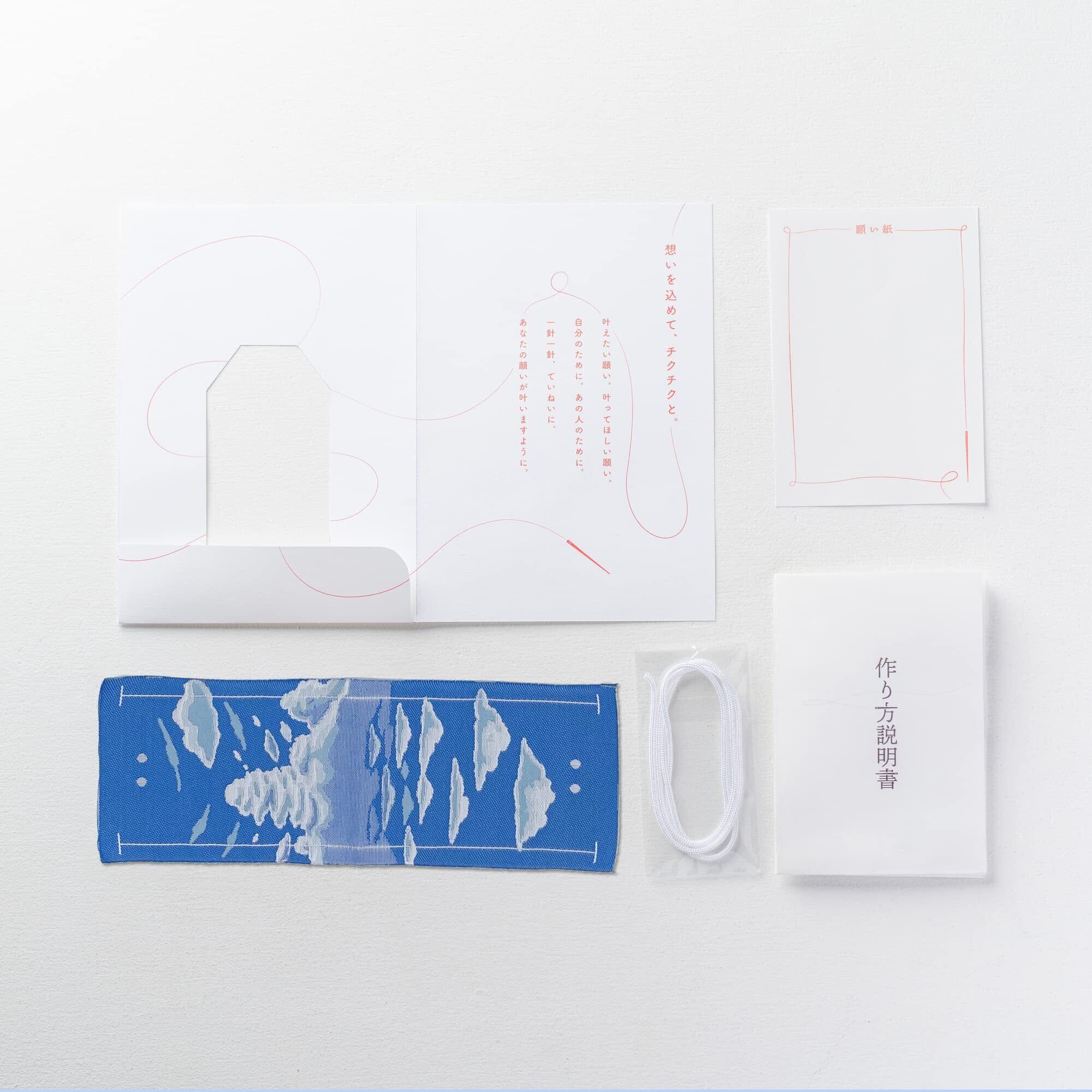 キットに含まれる品:お守り生地、打ち紐用の紐、作り方説明書、願い紙(願い事を書く紙)