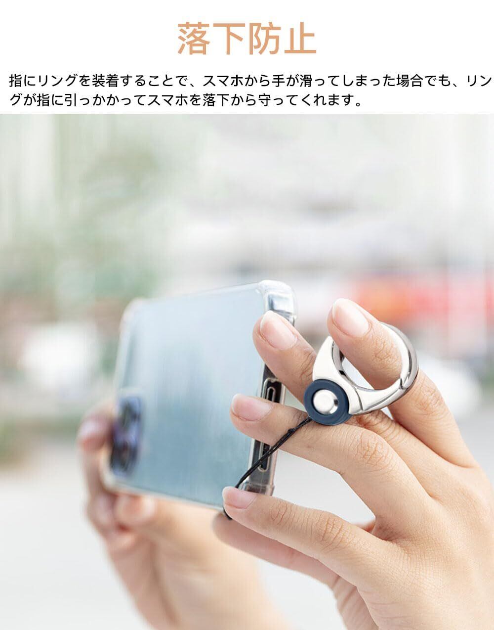 【防止落下】指にリングを装着することで、スマホから手が滑ってしまった場合でも、リングが指に引っかかってスマホを落下から守ってくれます。
