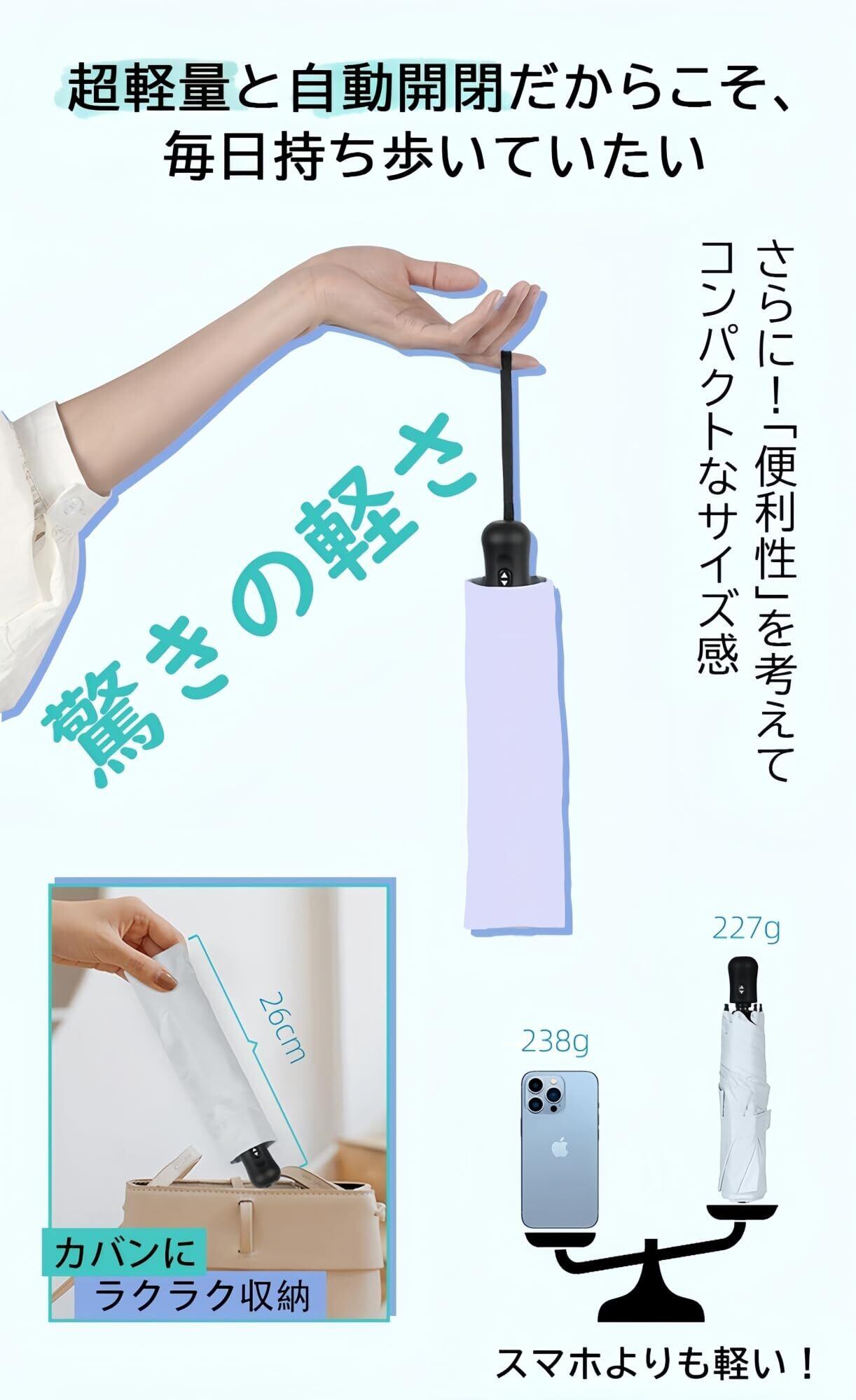 【超軽量227g·携帯便利】自動開閉折り畳み日傘なのに、ガラス繊維と航空アルミ合金傘骨を採用するので、 傘本体の重さは227gの軽量化に実現しました。スマホのように軽量で持ち歩きやすいです。子供から大人まで快適にご利用いただけます。通勤、通学、旅行や出張など適用。