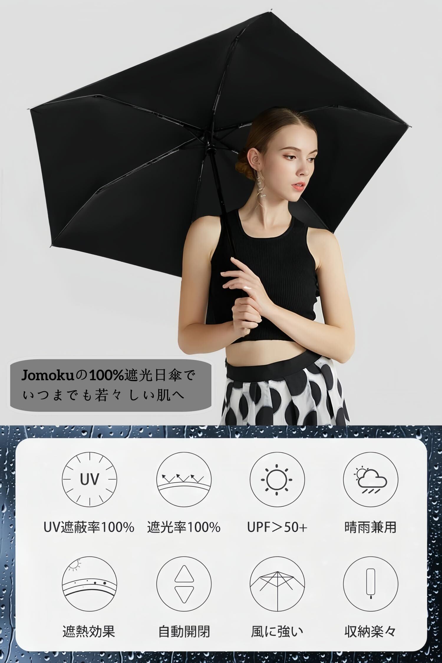 【210T高密度撥水傘布&錆が発生しにくい】210T高密度撥水傘布を使用したため、雨が傘布に接触すると丸い水滴になって滑り落ちます。また、傘骨はアルミ製ですので、一般的なおりたたみ傘より錆が発生しにくい、雨の多い梅雨時期にもラクラク使用できます。さらに、裏面のブッラクコーデングは優れた撥水性があり、雨の浸入を防止できます。春・夏・秋・冬オールシーズンで大活躍の晴雨兼用傘です!