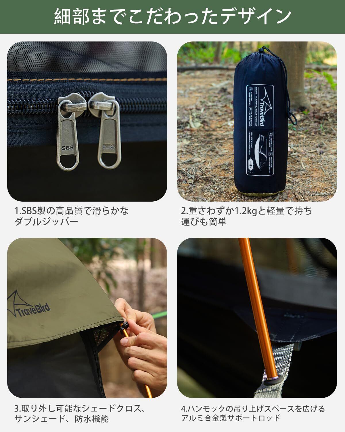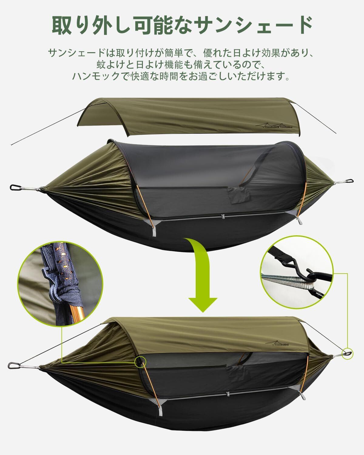「取り外し可能なサンシェード&一体型蚊帳」サンシェードの内部表面が全面銀めっきで、陽光が貫かないように防げ、UVカットができます。210Tポリエステル防水生地が小雨に耐えられます。急な天気変化に心配しません。高密度の蚊帳は、孔は48個/インチ、11000個/平方メートルで、網の孔が小さくて密度が高い、有効に蚊よけでき、虫などに邪魔されません
