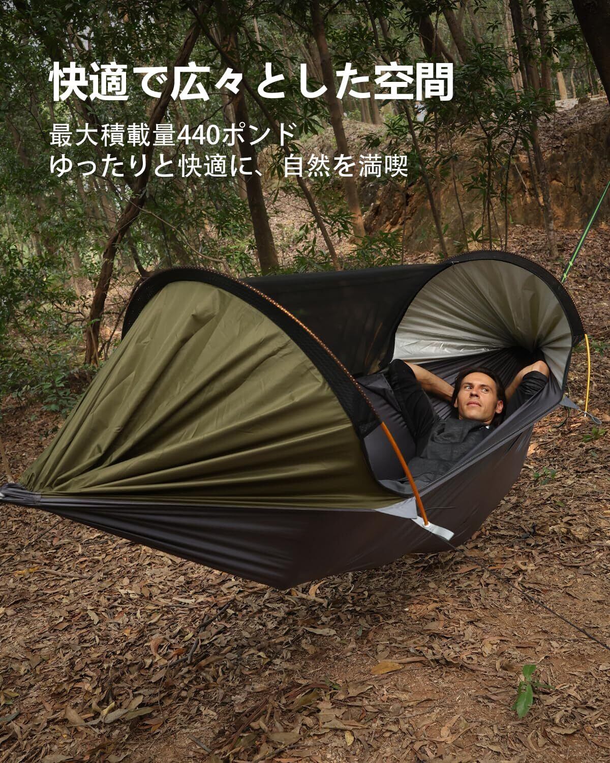 「超大な空間」スペースが広くて、ダブルハンモックの開いたサイズは270*140cmです。アルミ合金製サポート棒の設計で、ハンモックが完全に開けでき、非常に広いスペースを提供可能。200kgまで荷重でき、大人2人或いは子ども2~4人に適しています。内部にライトをかけるため、フックが設計されました。アウトドアで野営の夜を照らします。家族旅行、露営の最高チョイスです