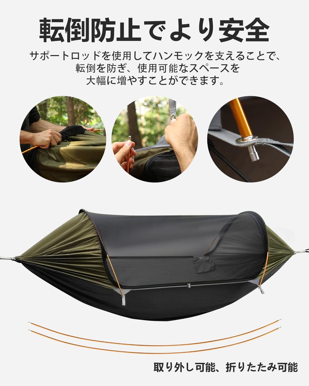 「3-in-1多機能」ポータブルハンモックの優れたところが3つあります。①蚊帳付きハンモック、サポート棒で支えられて、子どもなど家族が蚊に刺されないように防護可能。②サポート棒を取り出して、かやのファスナーを開いて収納して、普通の樹木用ハンモックとして使用可能。③サポート棒を立て、バックルの両端を固定されたアースくぎに差し込んで、樹木がなくてもハンモックテントとしても使用可能