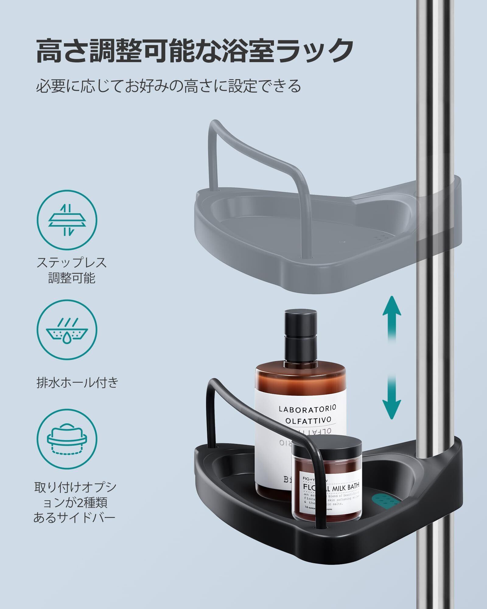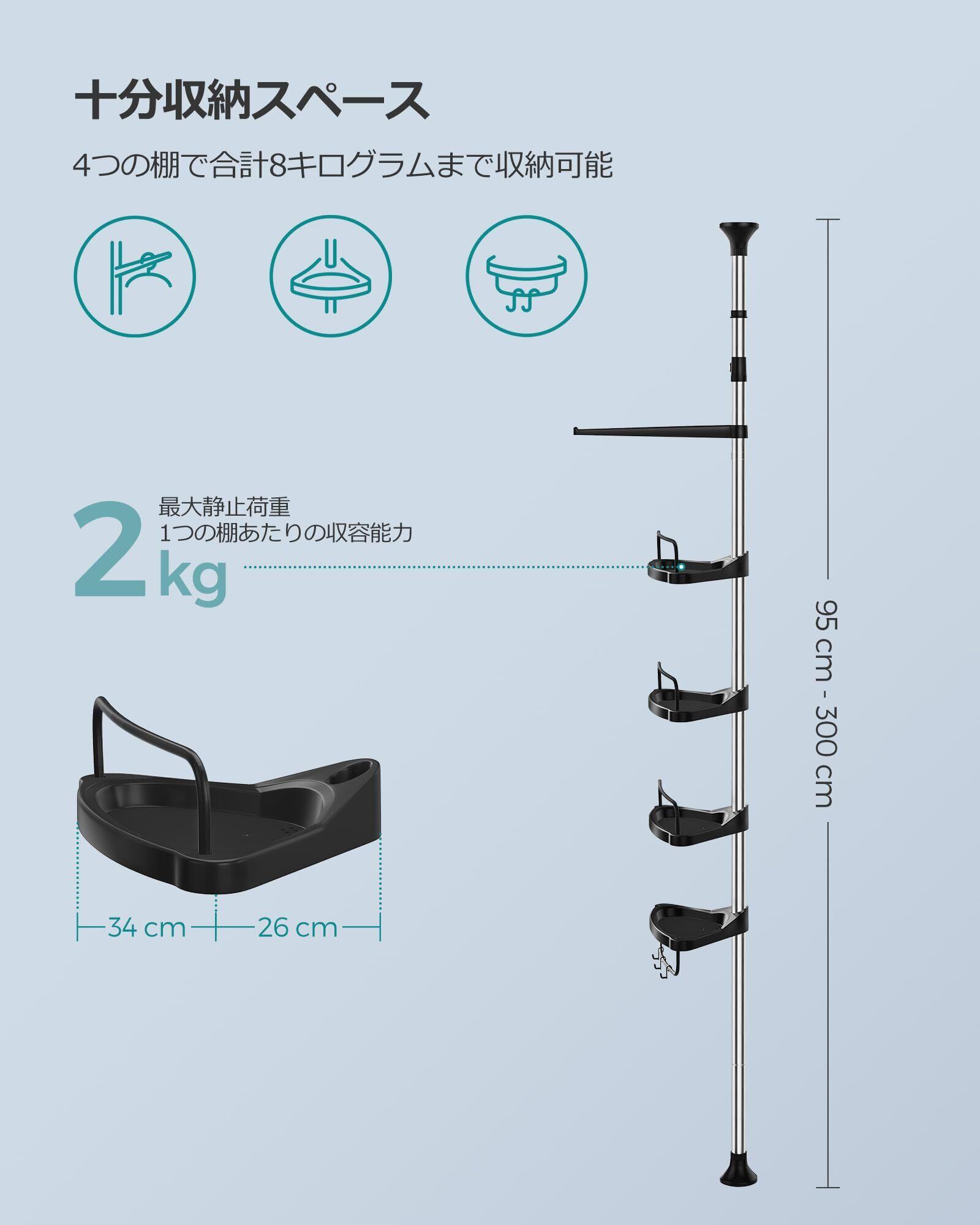 SONGMICS 浴室ラック 突っ張り収納ラック 高さ95-300cm 調節可能 4段式 伸縮棒 お風呂 シャンプー ラック バスシャワーラック ブラックBCB002B01