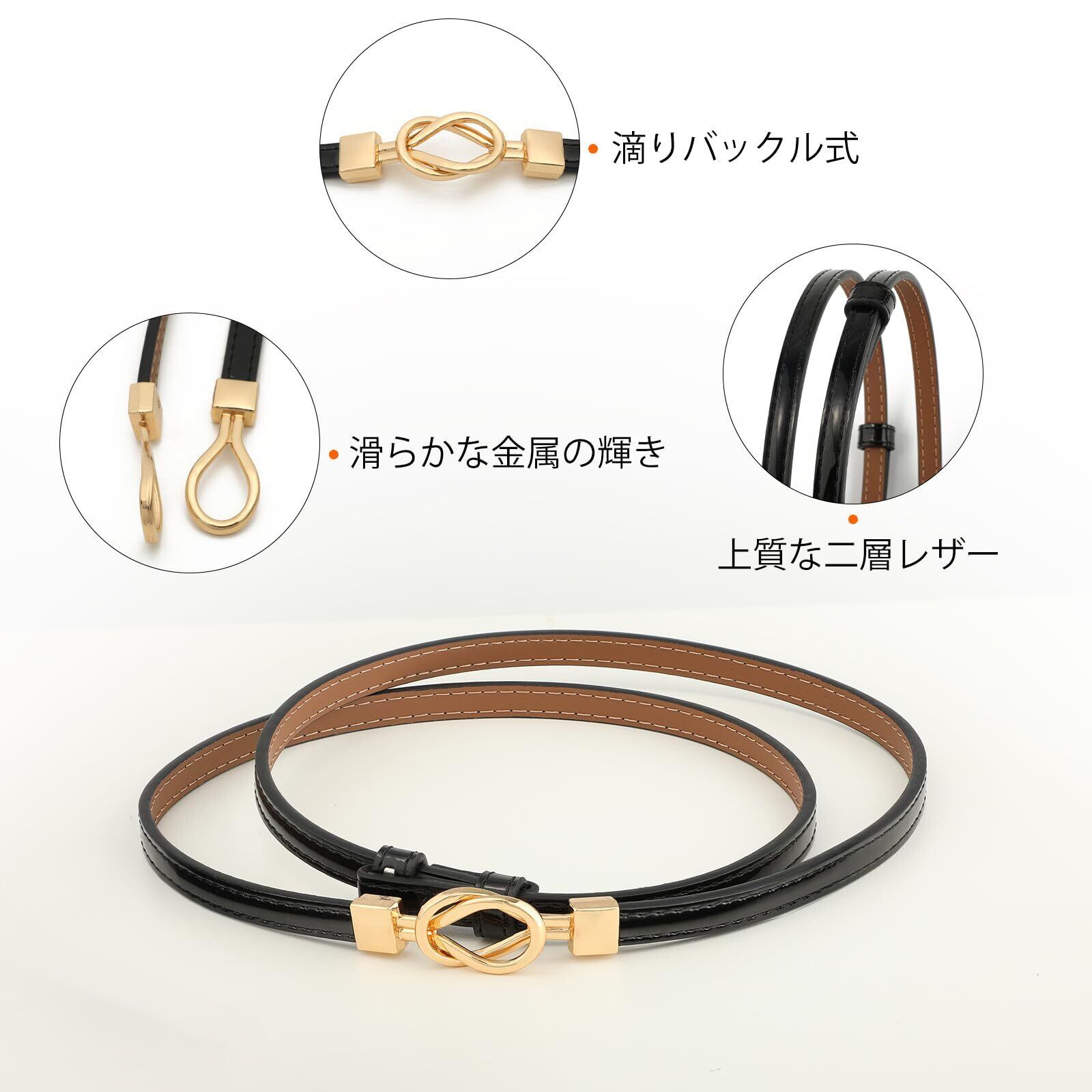 【細ベルトの素材】:本革、内層原色レザーは衣類を汚しにくい。バックル:合金、色あせしにくい。
