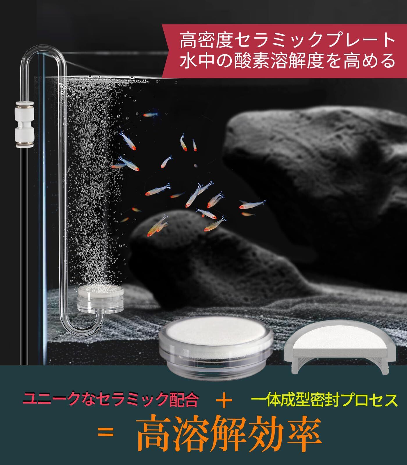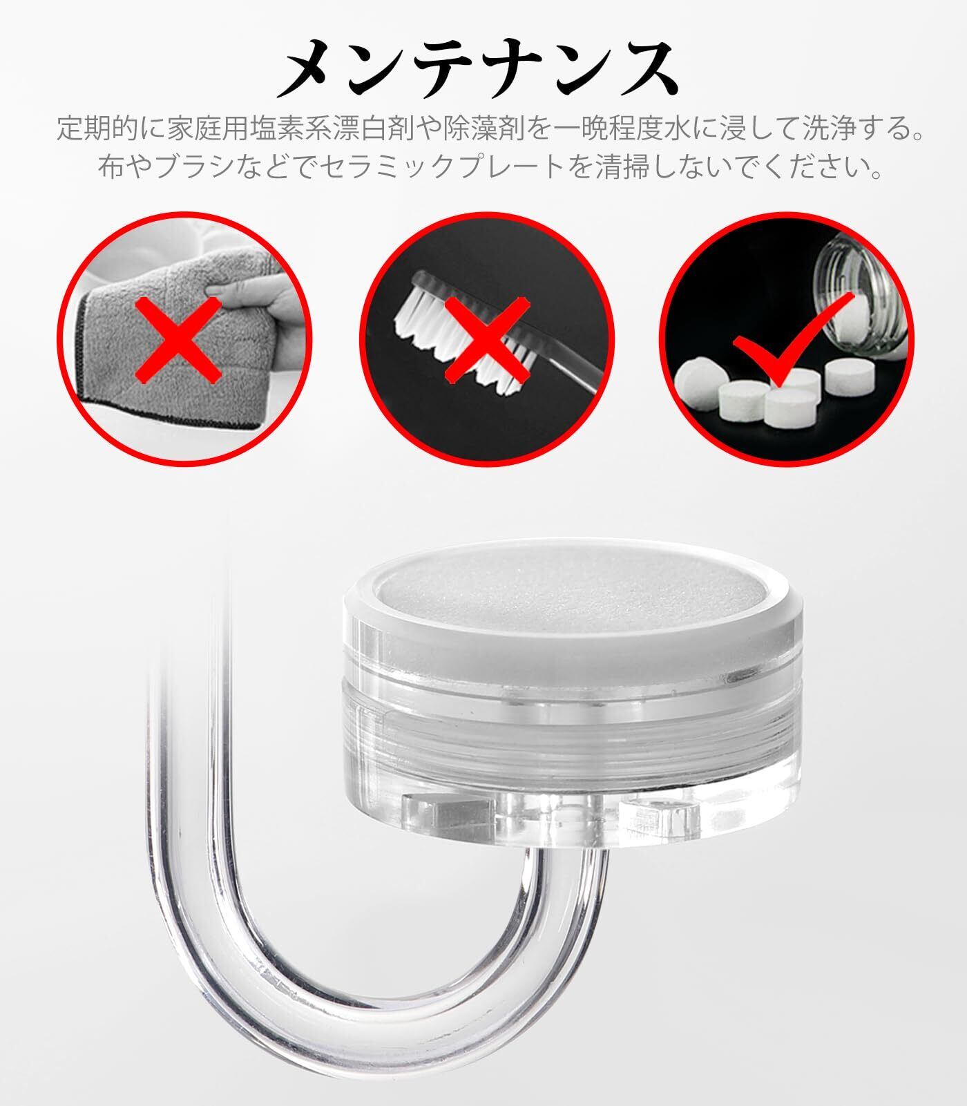 【ご使用注意】低出力ポンプに対応しています。エアポンプの出力や吐出量が大きすぎる場合は、使用前に流量調整バルブを取り付け、バルブを閉じた状態でエアポンプを作動させてください。その後、バルブを徐々に開き、所望のエア量に調整してください。吐出量が大きすぎるとエアープレートが破損する恐れがあり、元の状態(微細な気泡)に戻せなくなります。万が一エアープレートが破損した場合、当店では交換用プレートをご用意しておりますのでご安心ください。