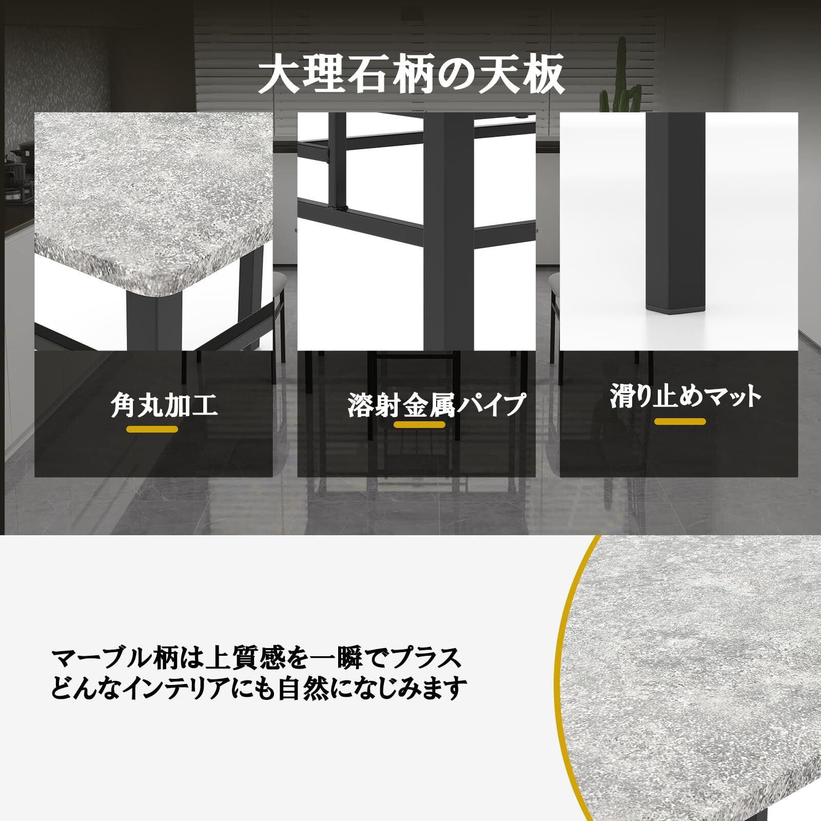 【おしゃれなダイニングテーブル】高密度パイン材を基材とし、表面には高品質なPVC大理石柄のシートを貼り合わせています。この特殊な加工により、美しい模様と優れた耐久性を実現しました。環境に優しく、コストパフォーマンスにも優れています。