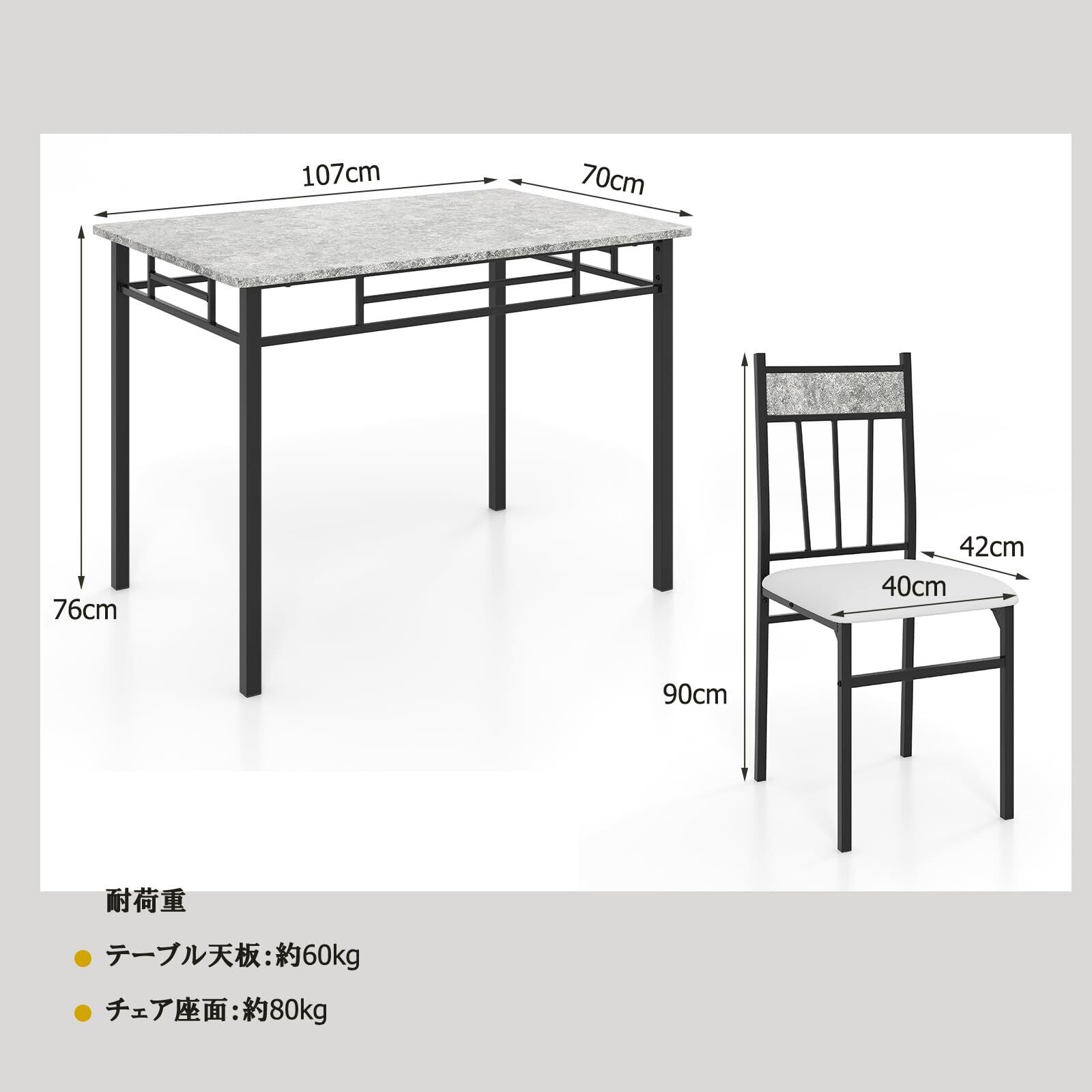 【サイズ】各チェア:約幅41x奥行き45x高さ94cm(座面高43cm);テーブル:約幅107x奥行き70x高さ76cm 【重量】各チェア:約4kgテーブル:約12kg 【耐荷重】(テーブル天板)約60kg、(チェア座面)約80kg 【梱包サイズ】117.5x80x16.5/33kg