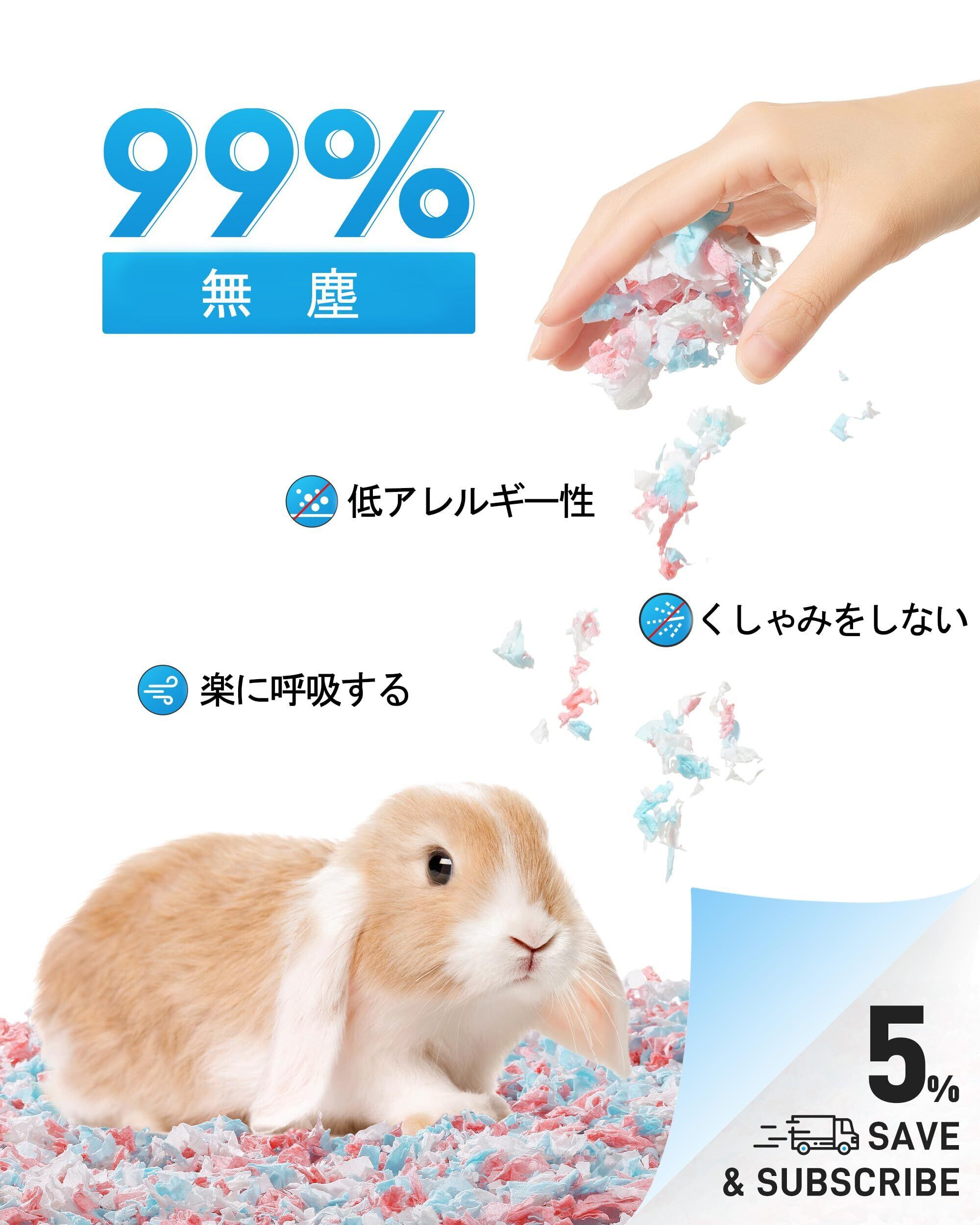 【99%の無塵・低アレルギー性】加熱殺菌および複数の除塵処理により、小動物の呼吸を守ります。天然染料を使用し、水に濡れても色あせしません。