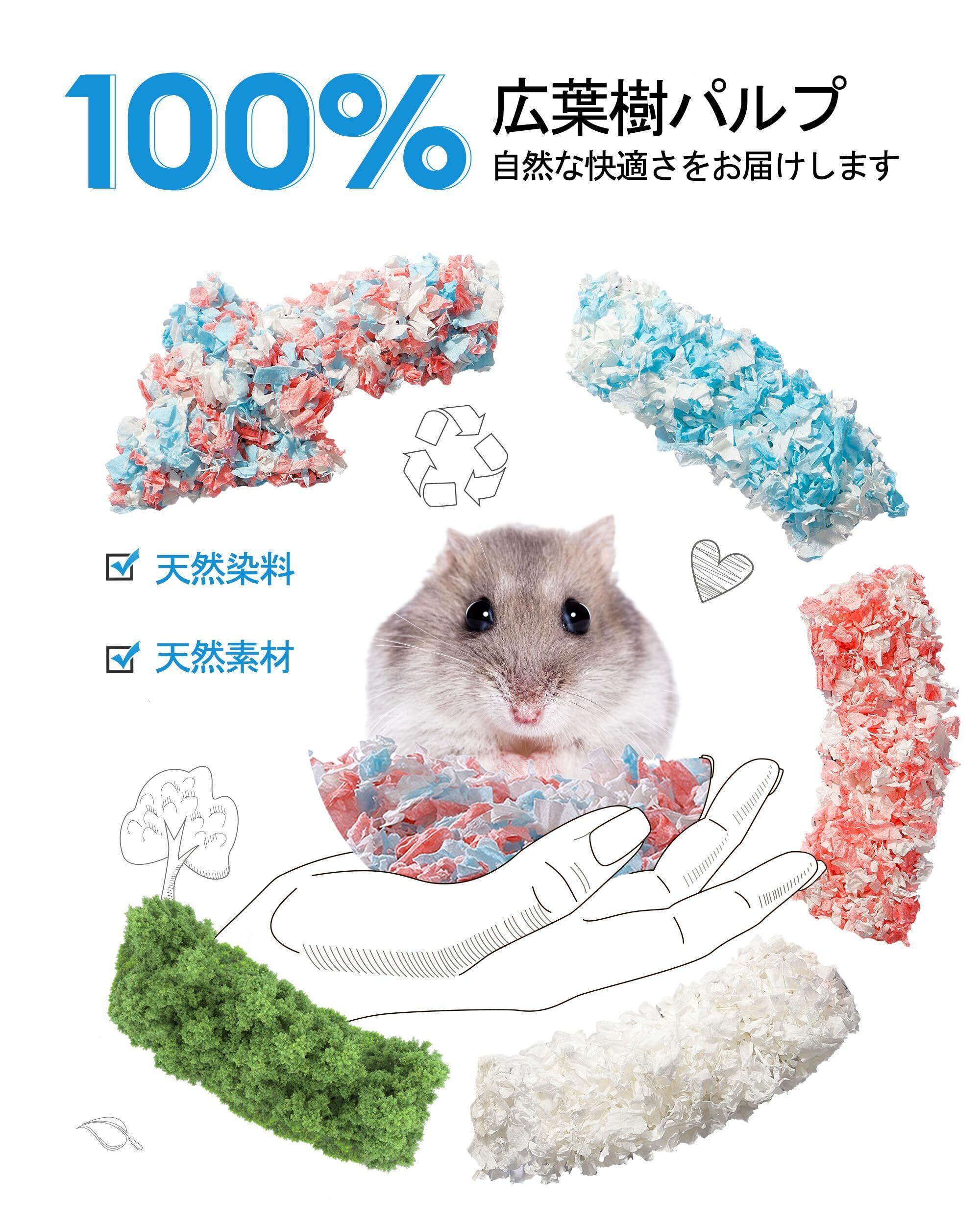 【高品質な天然素材】BUCATSTATEのハムスター床材は、FSC認証を取得した適切に管理された林場から採取された5年生の広葉樹を使用し、信頼の品質をお届けします。二次精製されたパルプを採用しているため、粉塵が少なく、通気性も抜群です。木のチップと比較して粉塵の発生がほとんどなく、優れた吸水性と消臭効果を兼ね備えています。ペットと飼い主様にやさしい低アレルギー素材です。
