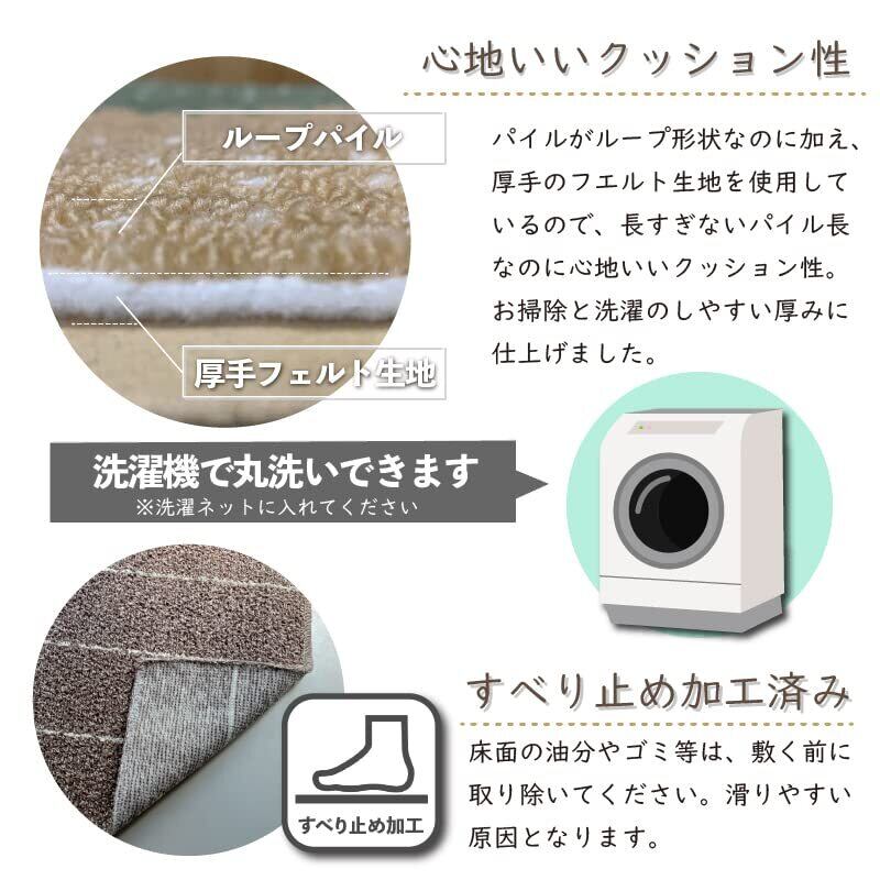大阪 泉州にて製造している自社工場直売の国産商品です。やさしいブラウンカラーをメインに使った、インテリアに合わせやすい雰囲気のマットです。ふんわりした足の踏み心地がおすすめポイントです。 滑り止め加工済み。