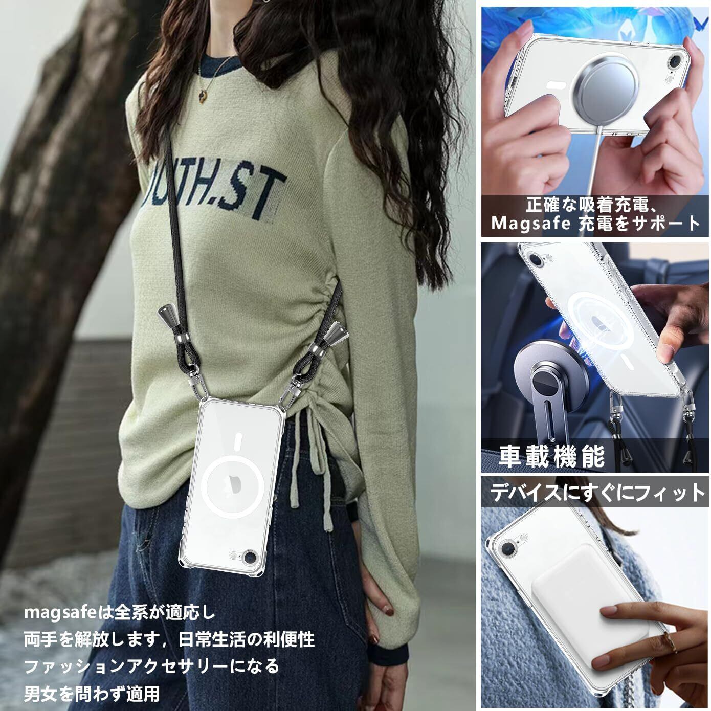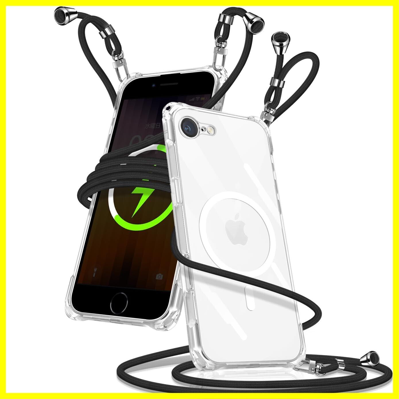 ケース 用の iPhone SE 第3世代 第2世代 クリア ショルダー マグセーフ対応 アイフォン7/8/se2/se3 カバー 肩掛け 斜めかけ 縄掛けケース 透明 TPU 携帯ケース 紐付き 織りストラップ付き 長さ調整可能 取り外し可能 紛失防止 落下防止 ワイヤレス充電対応(ブラック)