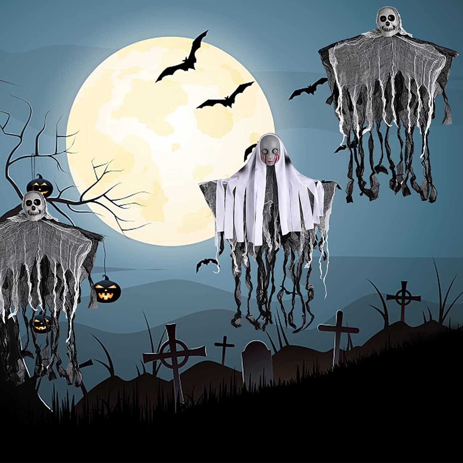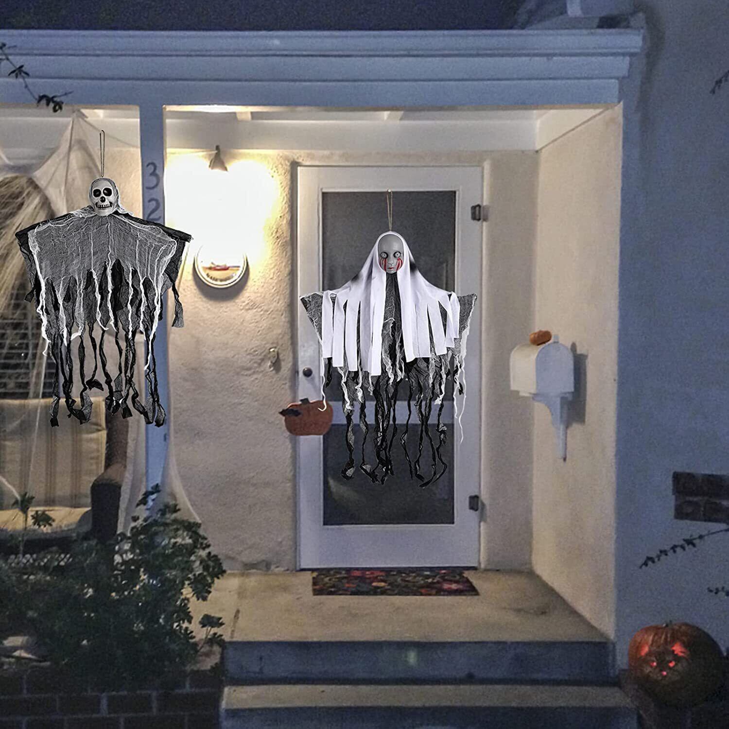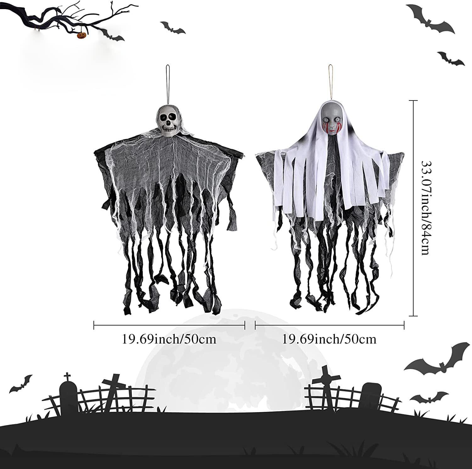 【雰囲気満点】:ハロウィンの怖いハンギングゴースは、ホラーパーティーの装飾には絶対にかかせないアイテムです。主に頭蓋骨と布で構成されています。アームは柔軟に調整できます。ぼろぼろの布が風に揺れ、ハロウィン気分満喫でき、ハロウィーンパーティーを盛り上げ、人々を怖がらせました。