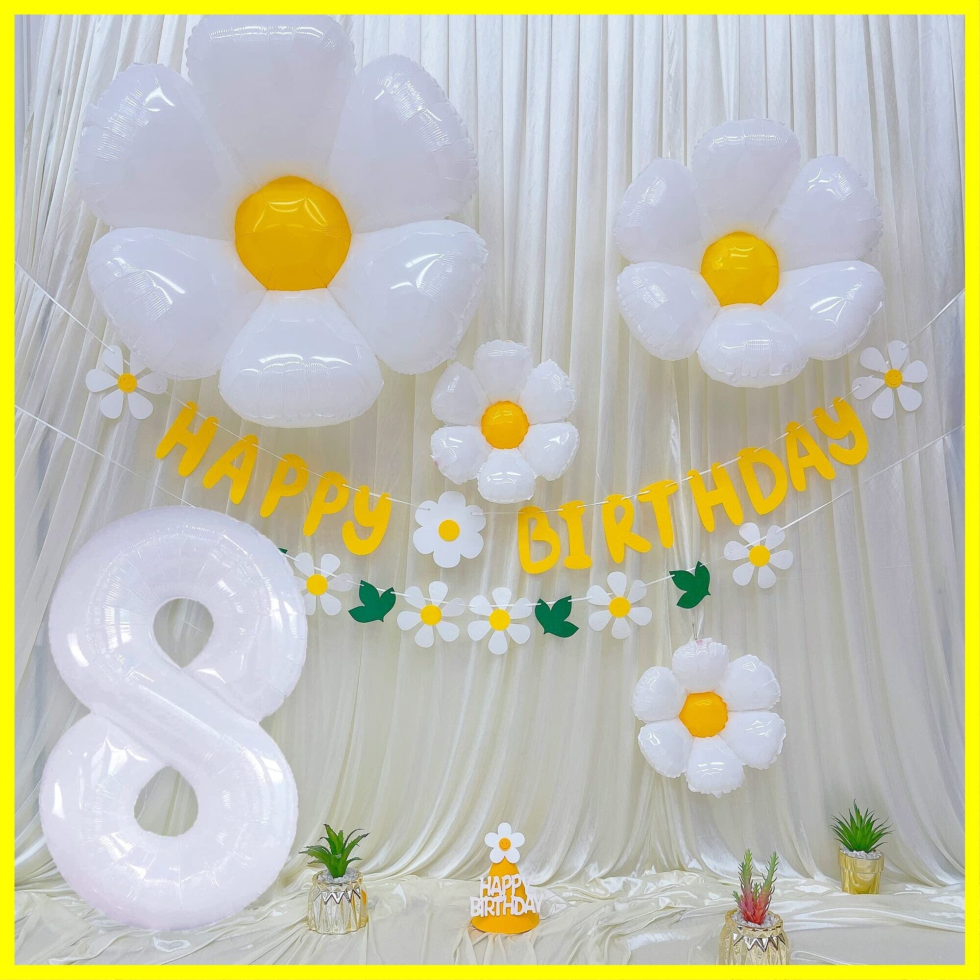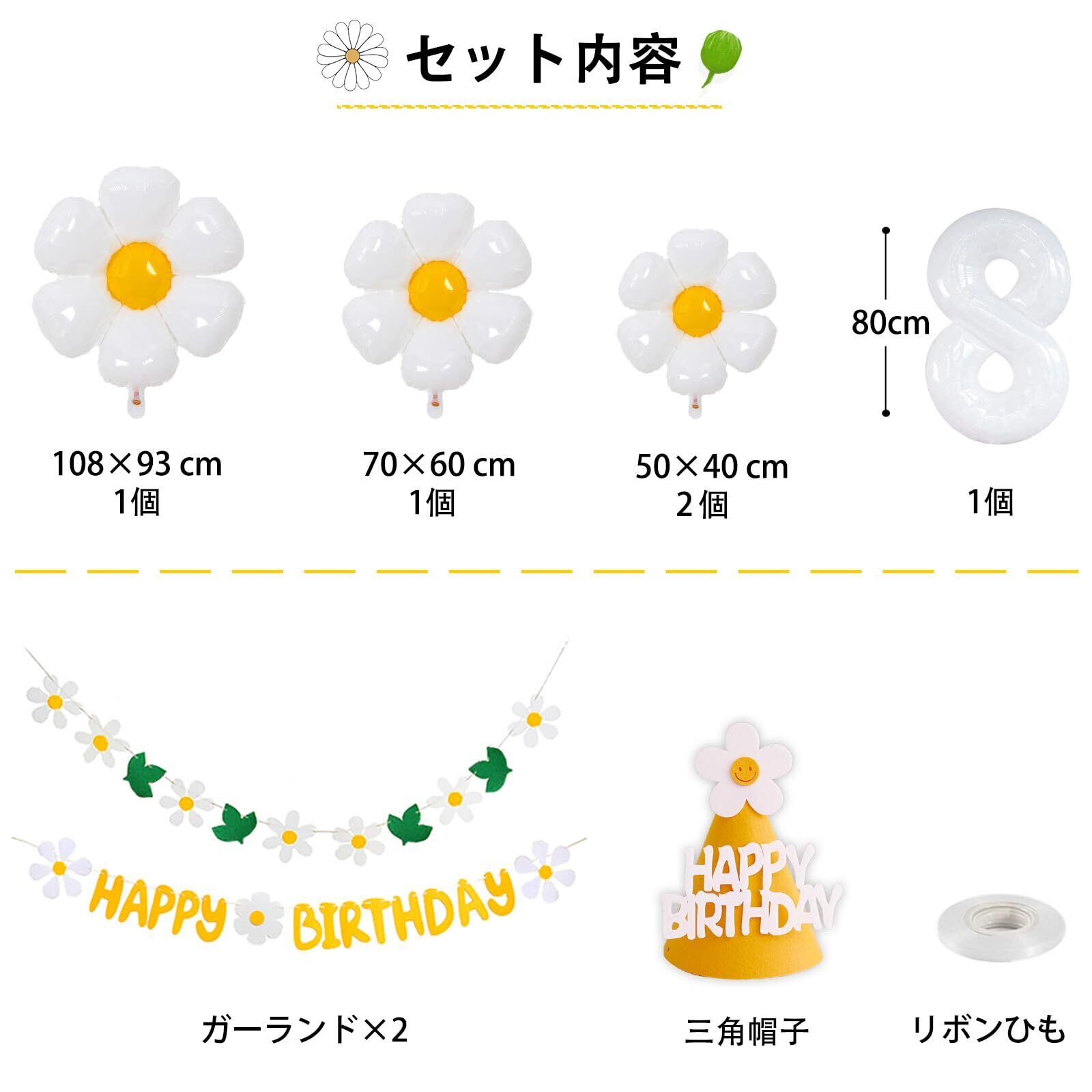 【セット内容】①フェルト布ガーランド×2 ②デイジーバルーン ×4 ③数字バルーン×1 ④三角帽子×1 ⑤リボンひも (10m)