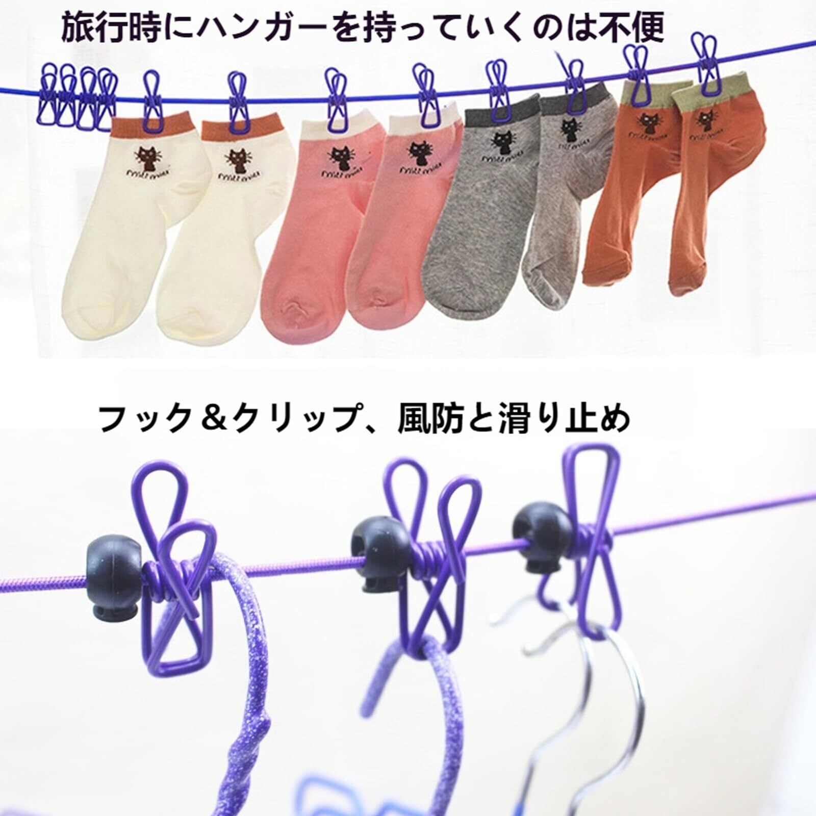 【旅行用 洗濯ロープ】12個の物干しクリップ、1.8m物干しロープ、13個の滑り止めポジショニングバックル。 サイズ:長さは約1.8 m。