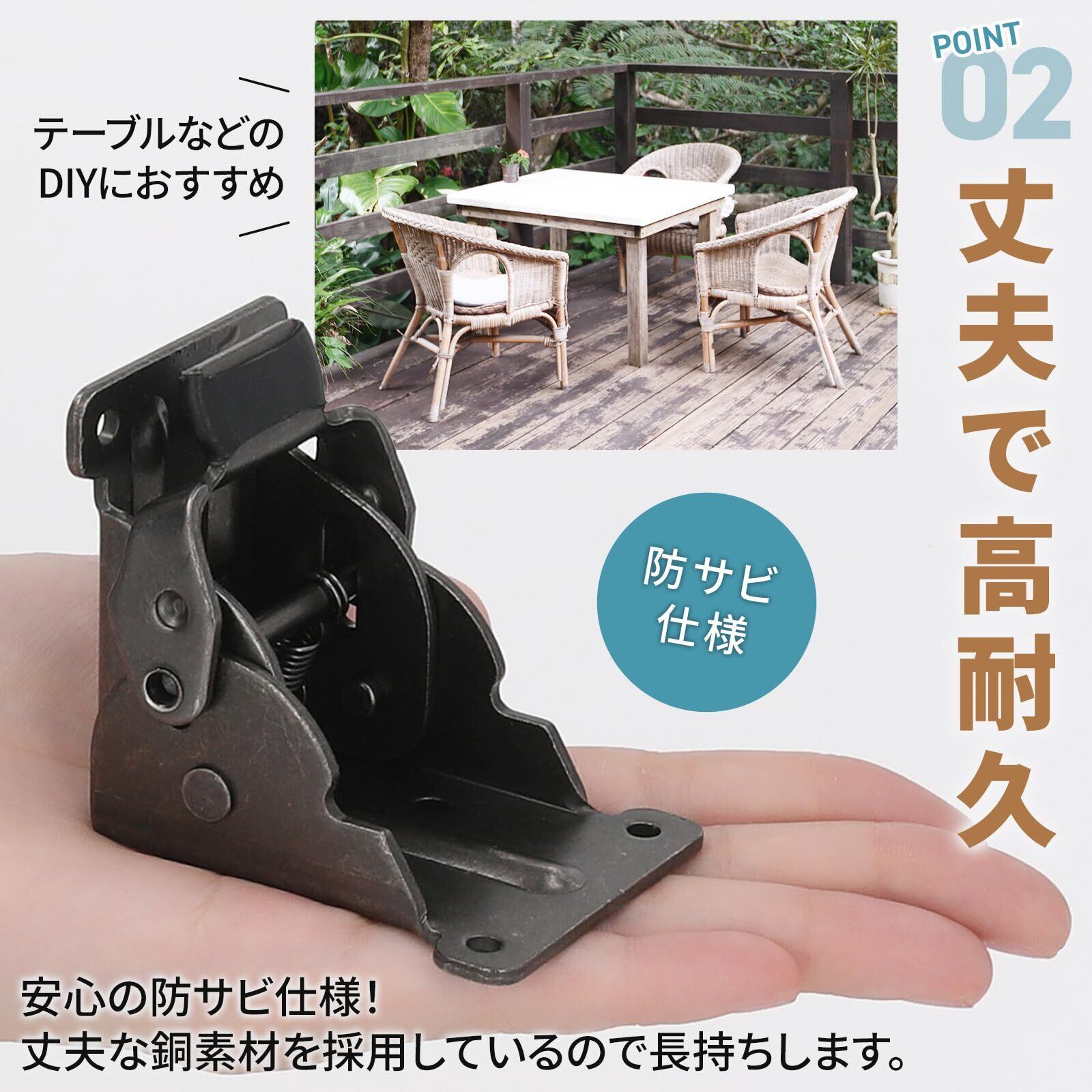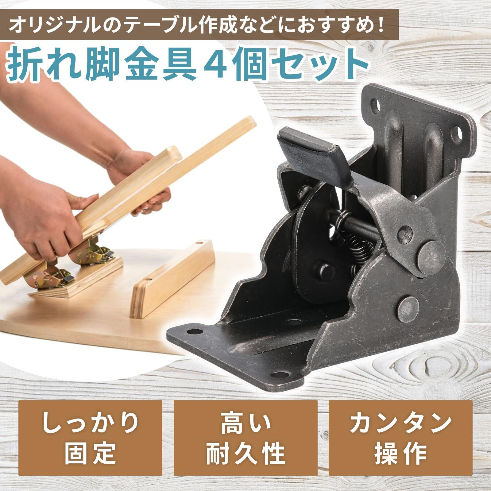 【特徴】付属のネジを固定するとすぐに使用でき、レバーを引いてワンタッチで折りたたみ可能です。脚を畳むことで片付けに役立ち、省スペースにもなります。また、手作り家具などのDIYにもお勧めです。