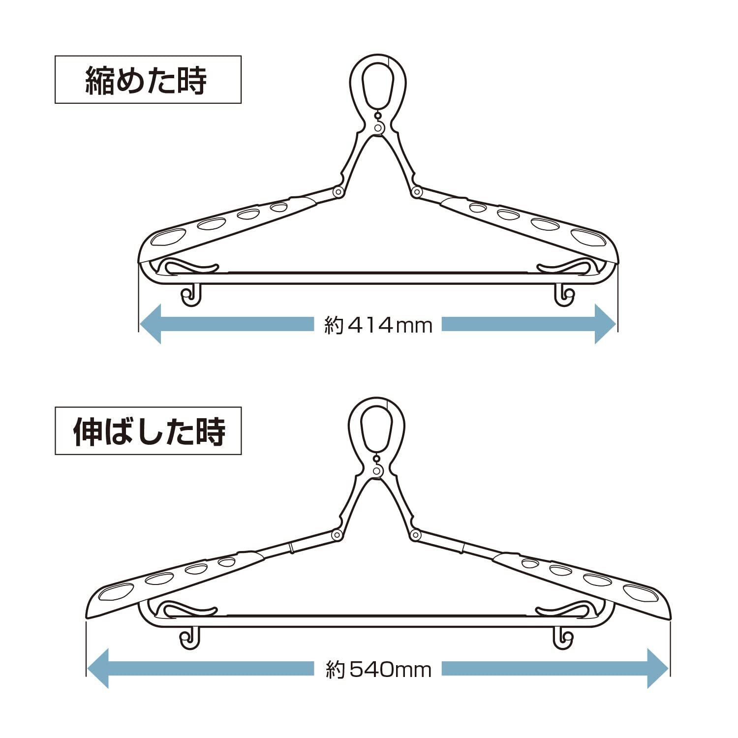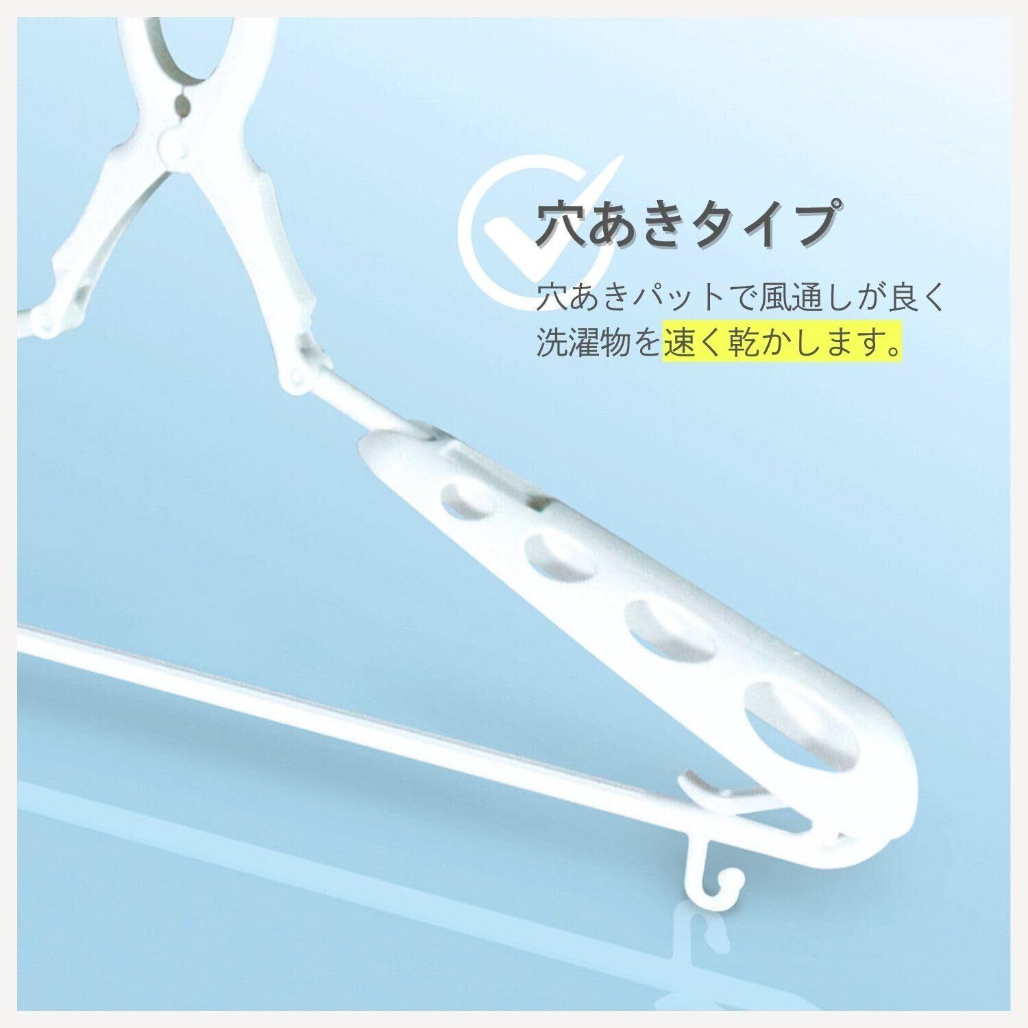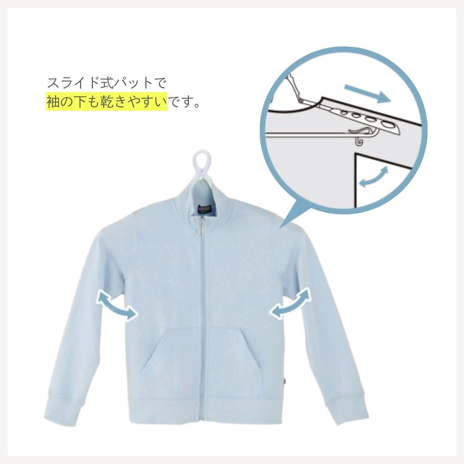 【立体的にきれいに干せるスライド式パット付きハンガー】肩の部分を立体的に干せるパット付きで型崩れを防ぎ、きれいに干せて乾きが早いのが特長です。パットはスライド式で衣類に合わせて調節できます。取り外しも可能です。