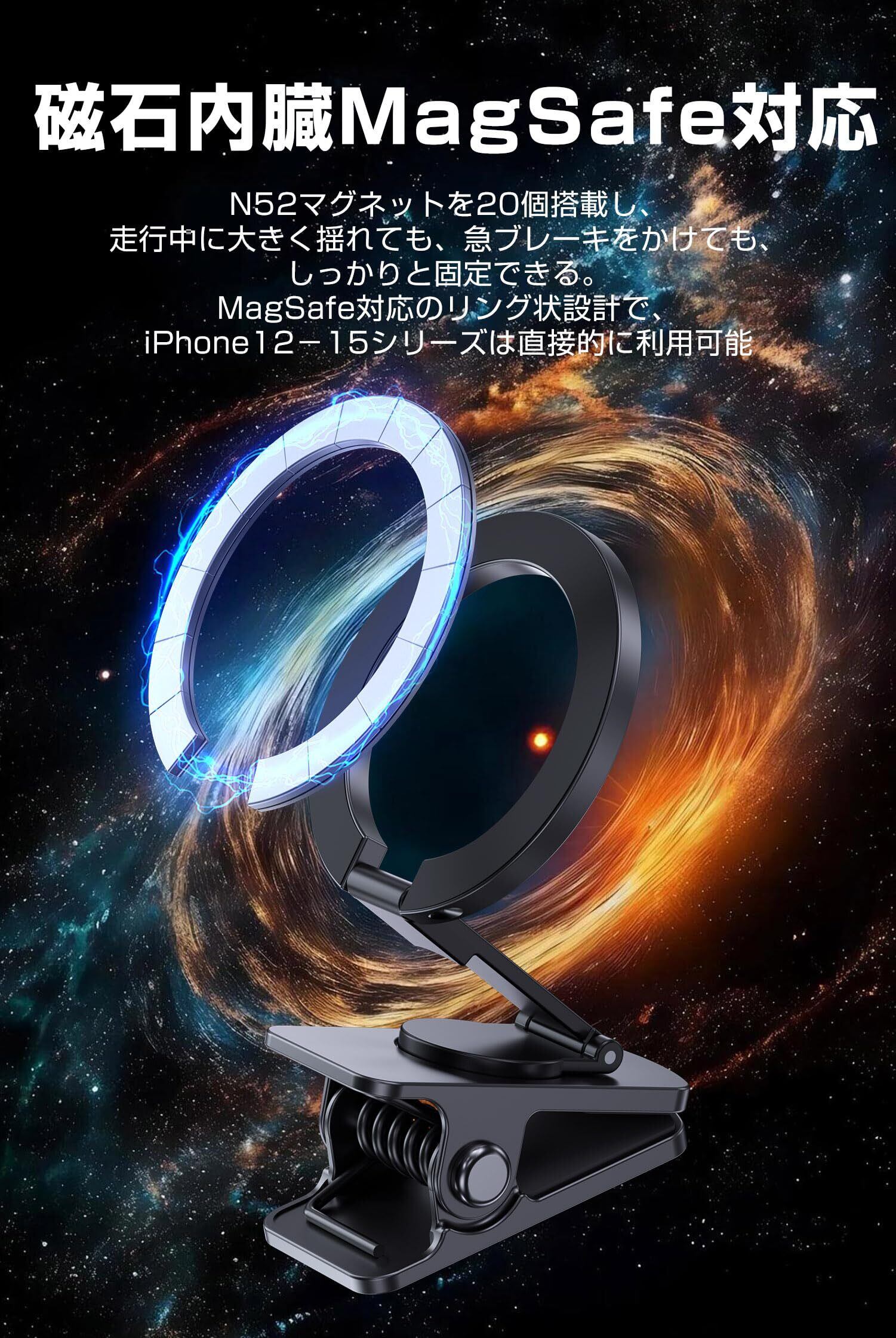 【Magsafe対応車載ホルダー】iPhoneのオリジナルコイルに基づき開発され、N52強力マグネットを採用しました。従来の端末を挟むタイプとは違い、わずか0.1秒で装着可能。走行中に段差のあるところで大きく揺れても、急ブレーキをかけても、しっかりと固定しています。