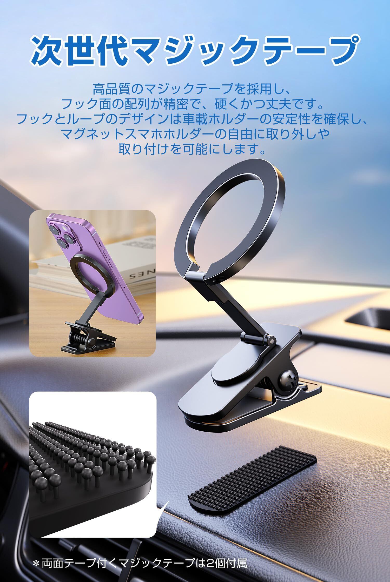 【次世代マジックテープ】高品質のマジックテープを採用し、フック面の配列が精密で、硬くかつ丈夫です。毛羽も立ちにくい。フックとループのデザインは、車載ホルダーの安定性を確保し、マグネットスマホホルダーの自由に取り外しや取り付けを可能にします。ヒント:使用前にダッシュボードの適切な場所を選んでください。粘着力を保つため、再度使用しないはお避けください。3M粘着剤が効力を失った場合は、予備のパッドを使用してくだい。
