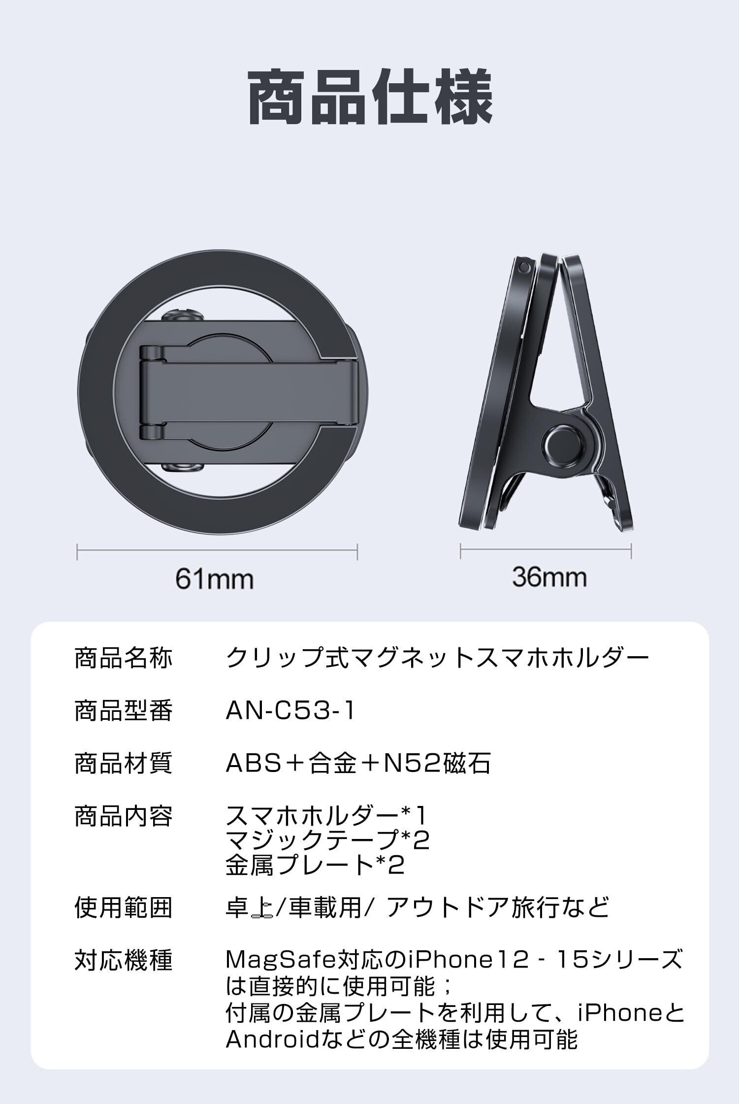 対応デバイス Magesafe対応機種iPhone12/13/14/15シリーズは直接的に使用可能, 付属の金属プレートを利用して、Androidシリーズのスマホも対応可能