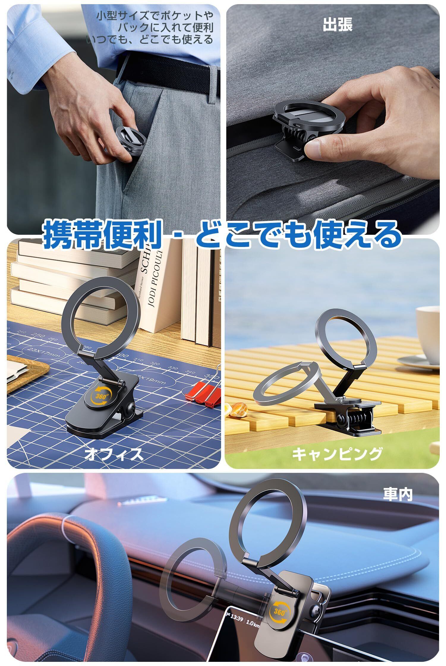 Antion マグネットスマホホルダー クリップ式 MagSafe対応 マジックテープ付き スマホスタンド 折り畳める 車載ホルダー 三関節調整 携帯スタンド 卓上用 車載用 旅行用 携帯便利