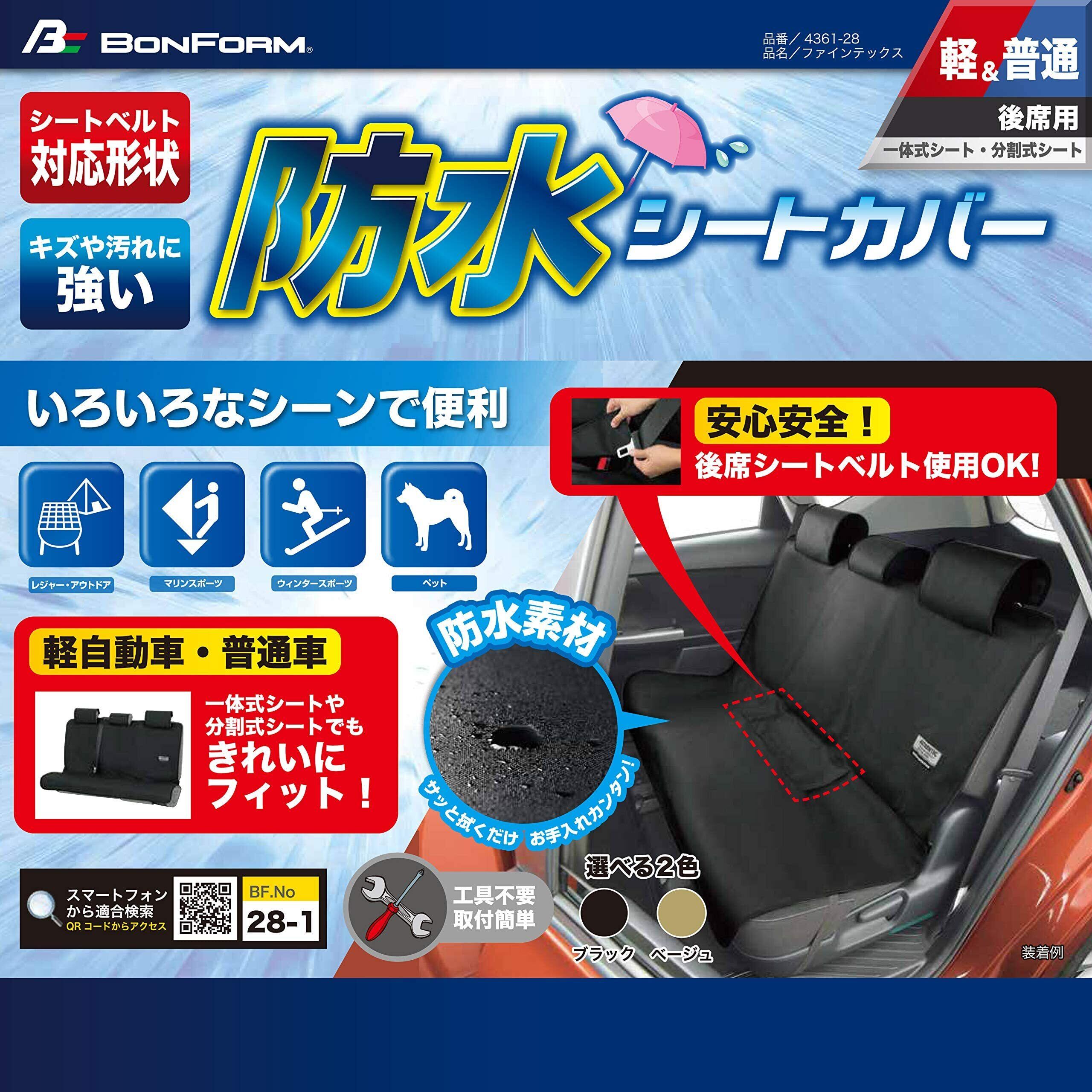 ボンフォーム(BONFORM) シートカバー ファインテックス 軽/普通車 後席単品 防水 取付簡単 丸洗いOK リヤ(シートベルト対応) ブラック 4361-28BK