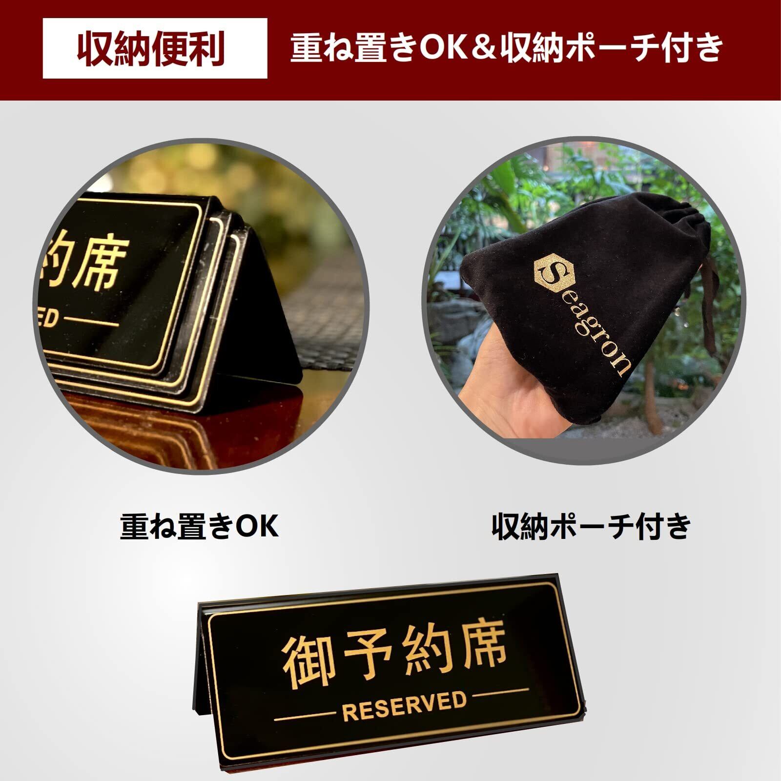 【収納便利】重ねて置くことが出来、省スペースです。Seagronのオリジナル収納ポーチが付き、予約席プレートを使わない時の収納も便利です。