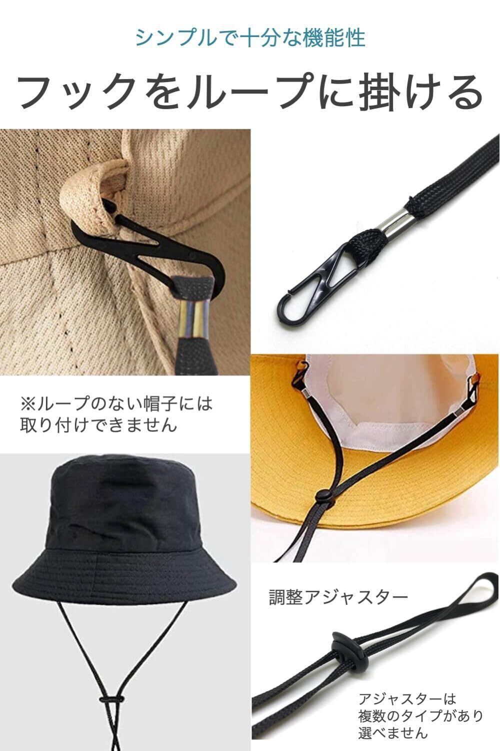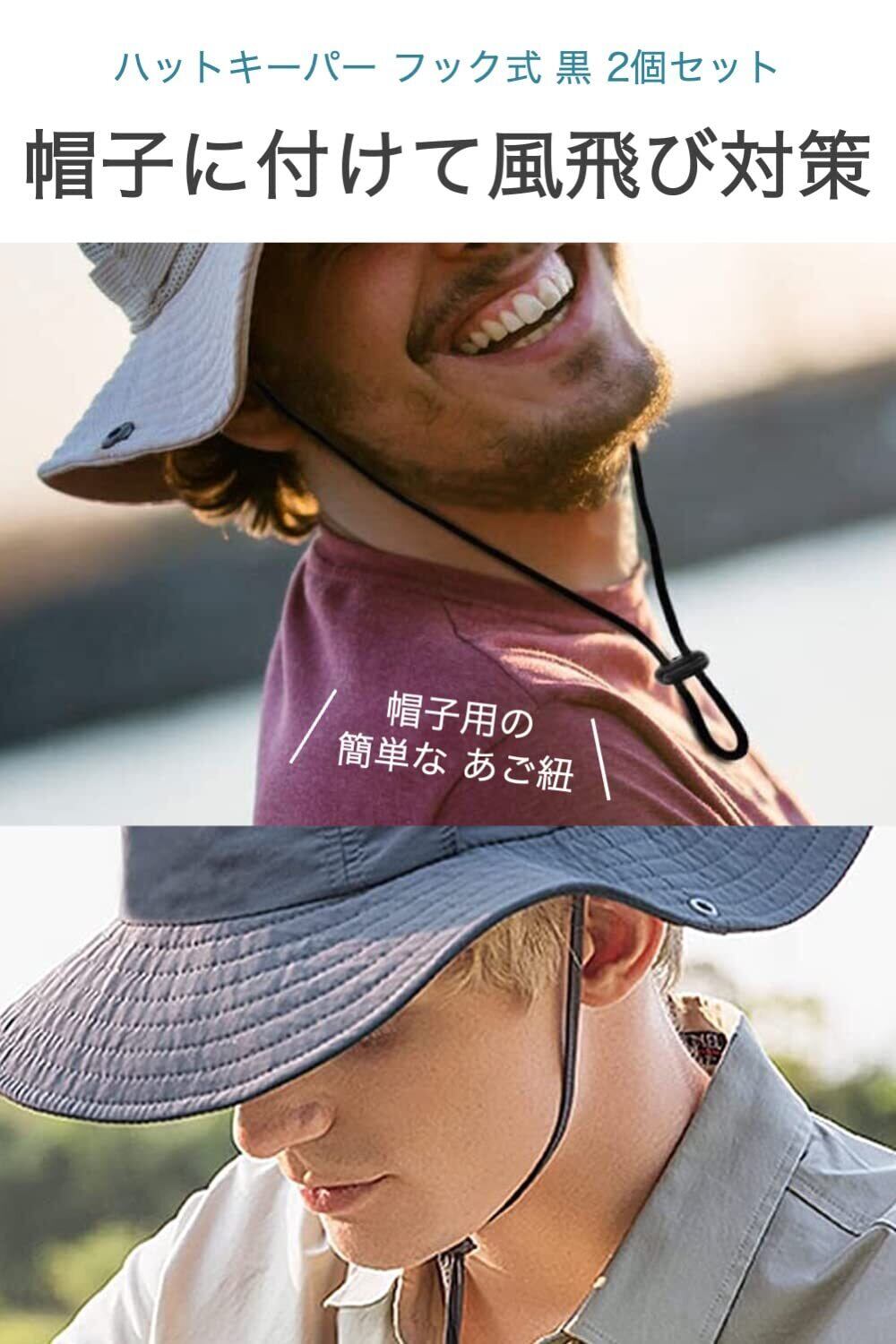 [wumio] ハットキーパー フック式 黒 2個セット ループ 帽子クリップ ハットクリップ 帽子止め ストラップ 強風 飛ばない 固定 簡単 シンプル 帽子ホルダー あご紐