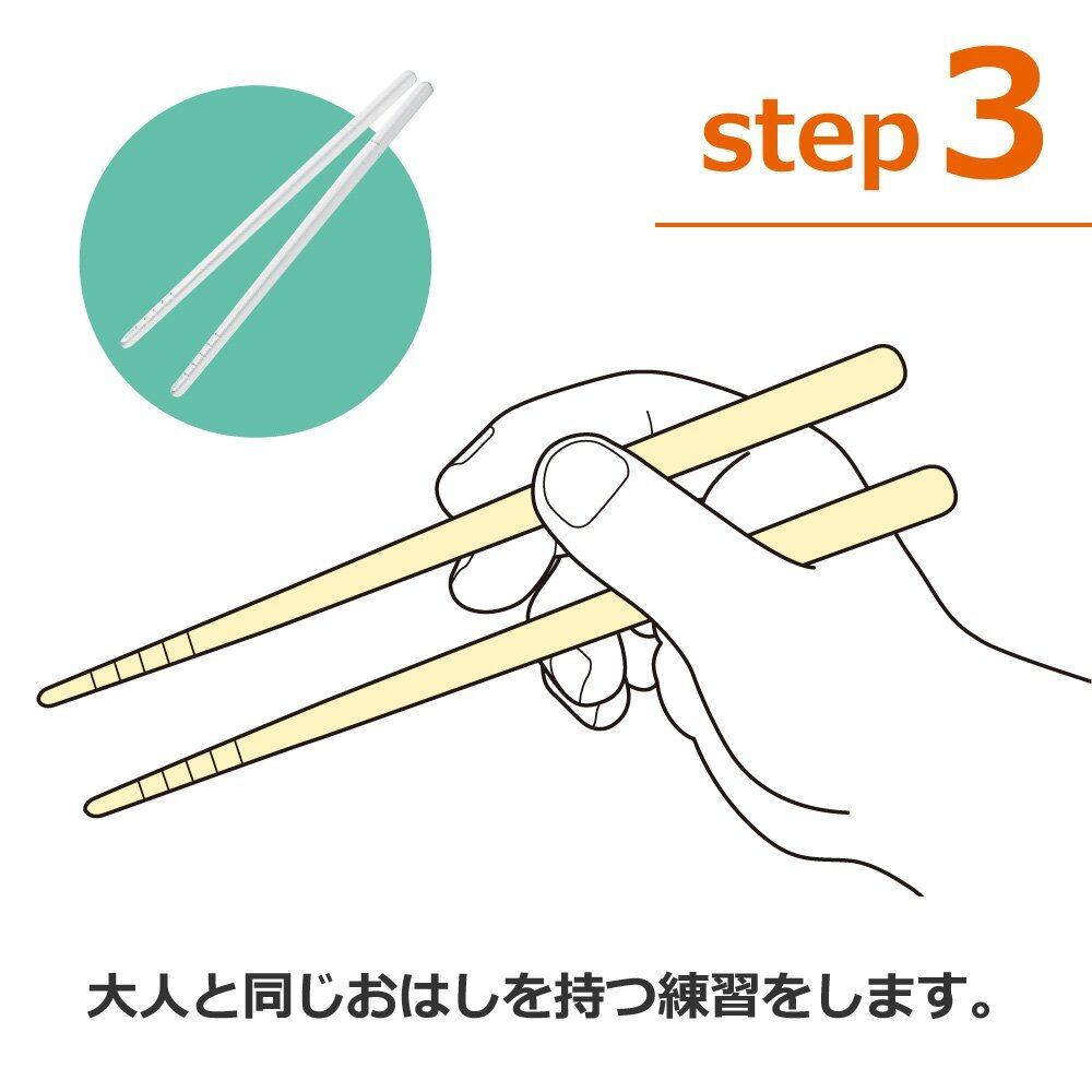 子どもの手指の成長に合わせ、三段階にステップアップしながら効果的にトレニングできるしつけ箸。