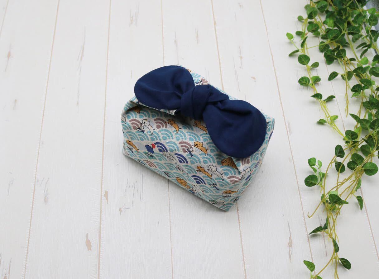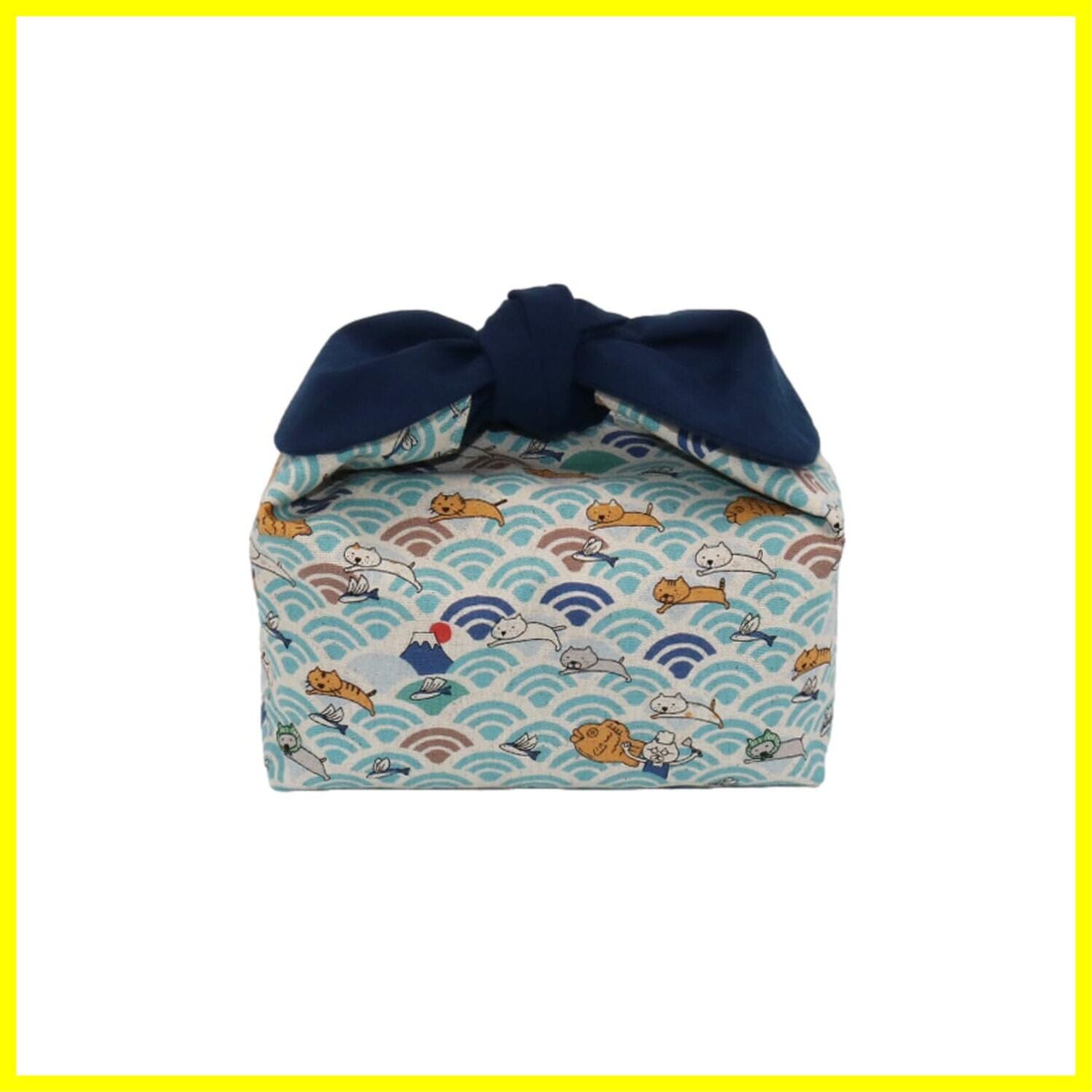 お弁当袋 保冷保温 ランチバッグ 紐なし 結ぶタイプ あづま袋 リボン 和柄 (青海波ネコ)