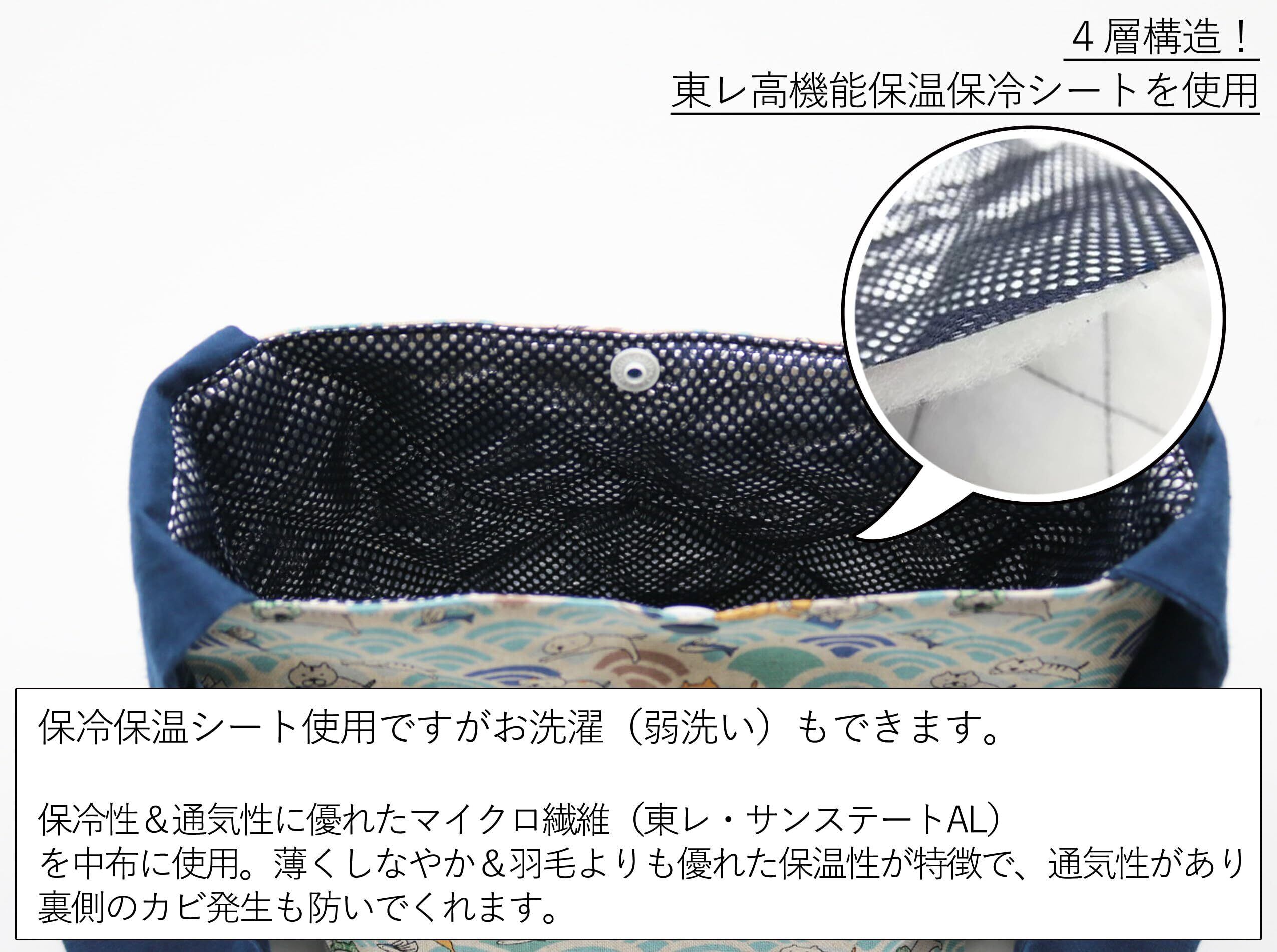 保冷・保温のお弁当袋で、お洗濯が可能です。一般的な保冷保温シートとは違い、裏にカビが生えたりはがれてくることがなく布のような柔らかさがあります。折り目の角が破れることもありません。
