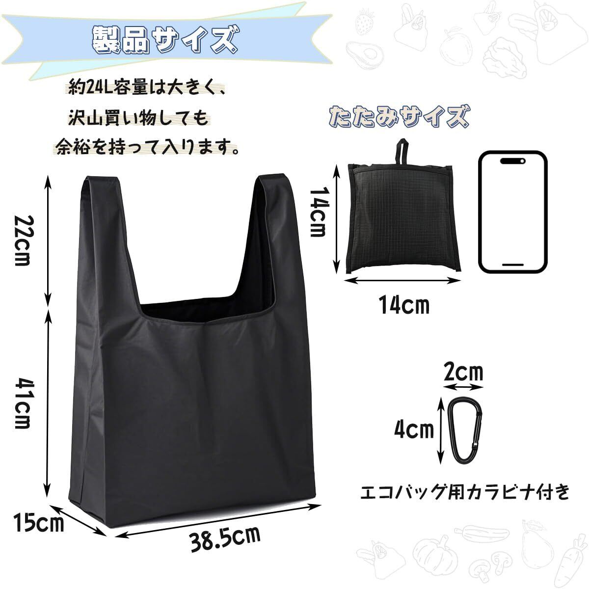 「商品内容」折りたたみエコバッグ*1このエコバッグは、シンプルでスタイリッシュなデザインだから、男性も女性も気兼ねなく使えます。カラビナ*1買い物袋が持ち忘れ・紛失を防ぎます!