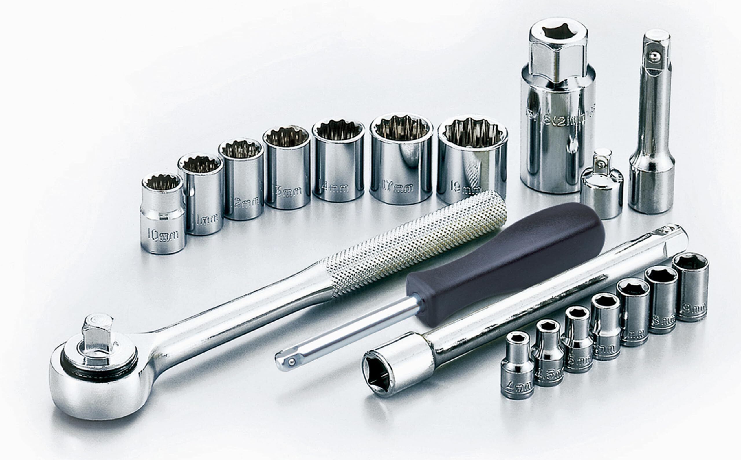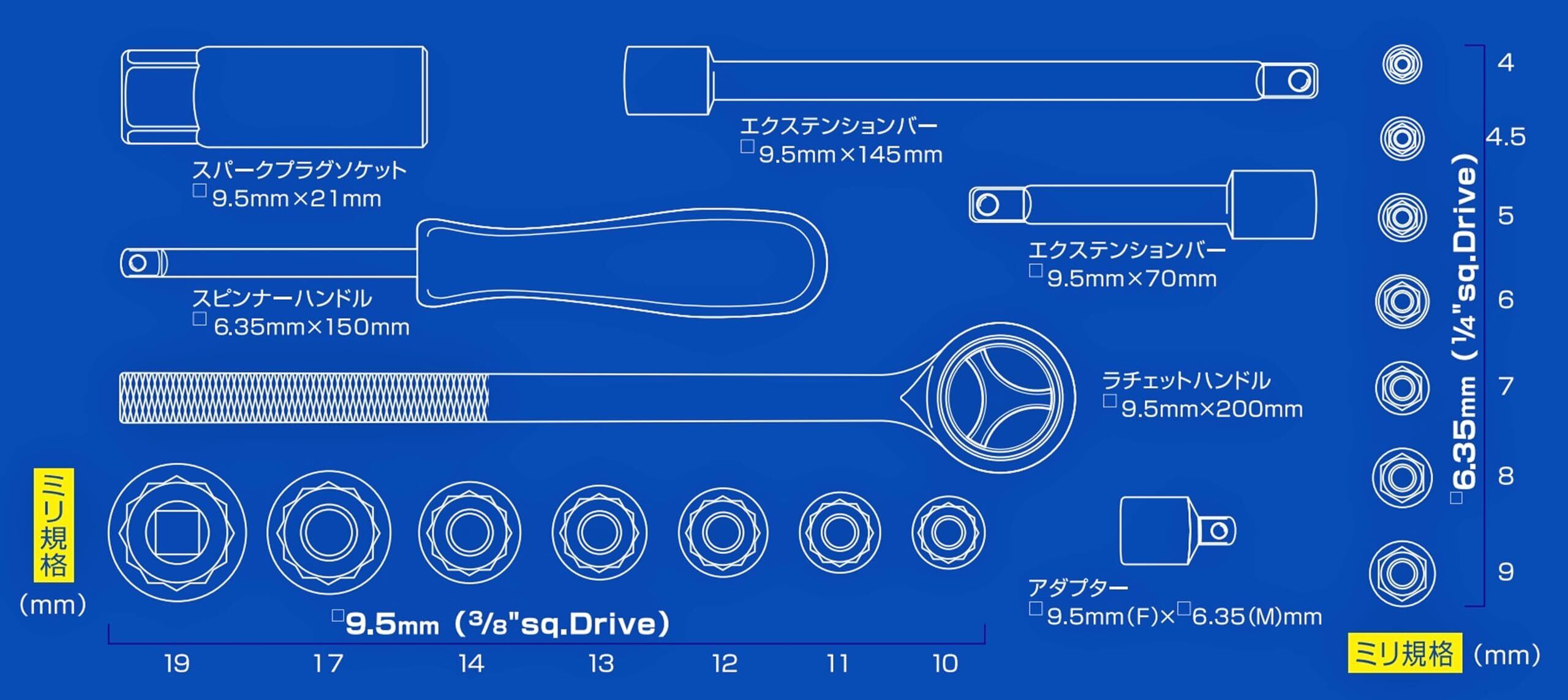 12角ソケット(9.5mm3/8″Sq.Drive)ミリ規格 10, 11, 12, 13, 14, 17, 19mm