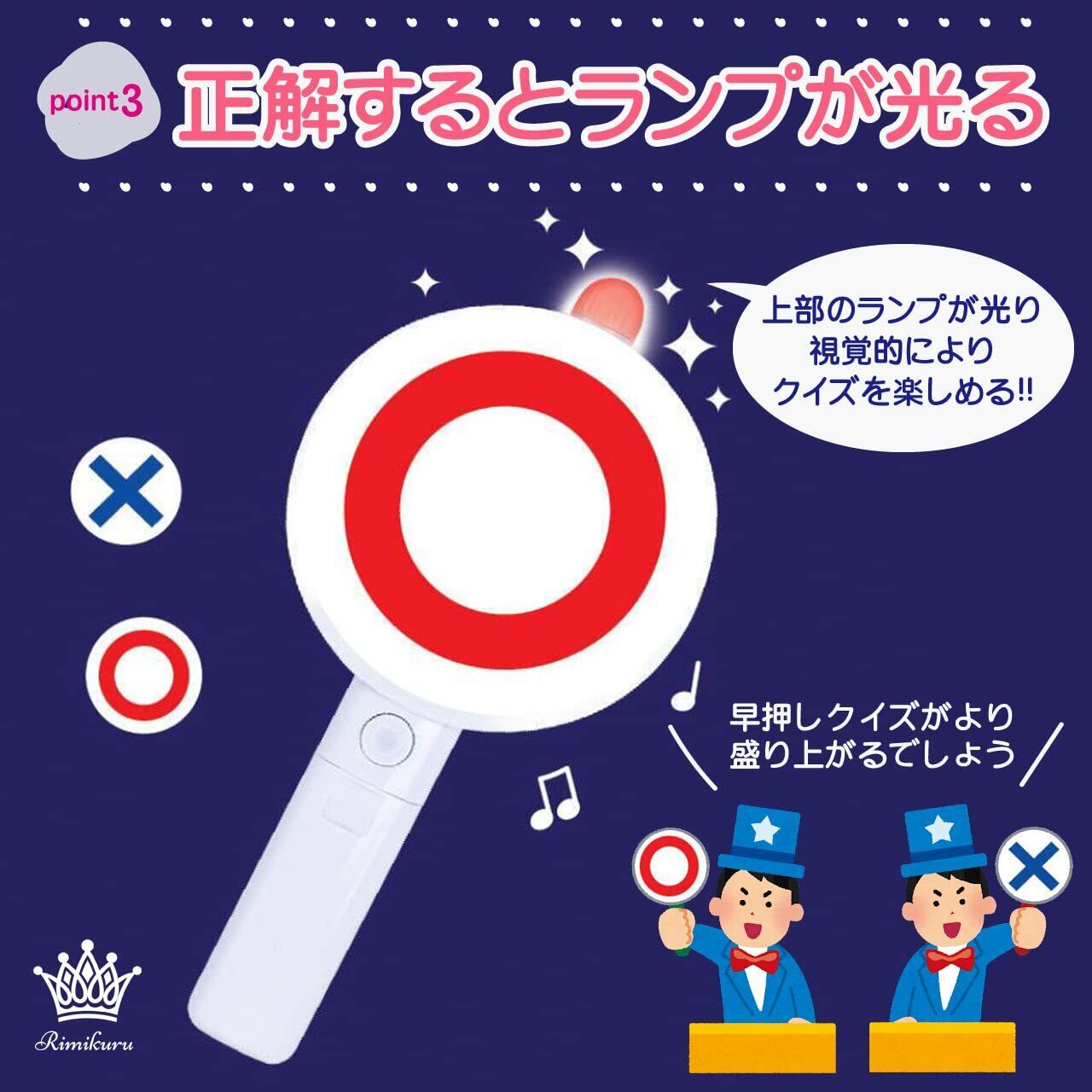 正解するとランプが光る:正解ボタンを押すと、上部のランプが光り「ピコン」と音が鳴るマルバツブザーになので、視覚的によりクイズを楽しめるおもちゃです。 音と光で楽しめるこちらのピンポンブーで早押しクイズがより盛り上がるでしょう。