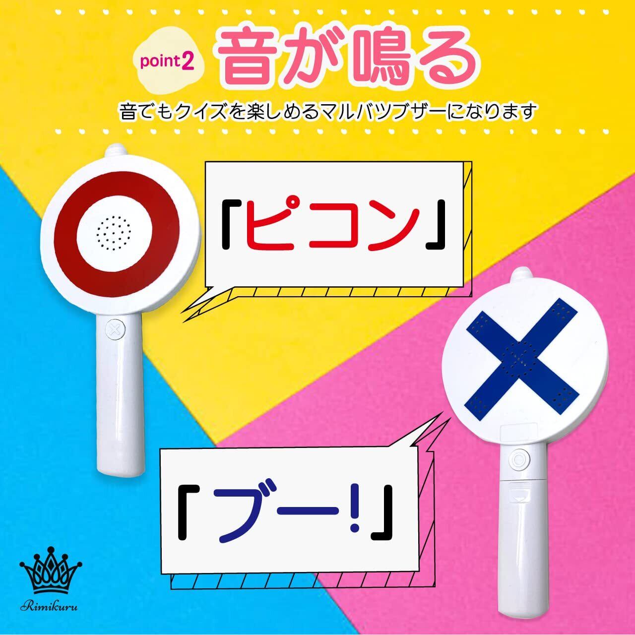 音が鳴る:こちらのマルバツブザーはサウンドボタンで音が鳴る仕様になっており、正解ボタンを押すと「ピコン」と音が鳴り、不正解ボタンを押すと「ブー」という音が鳴ります。音でもクイズを楽しめるピンポンブザーになります。