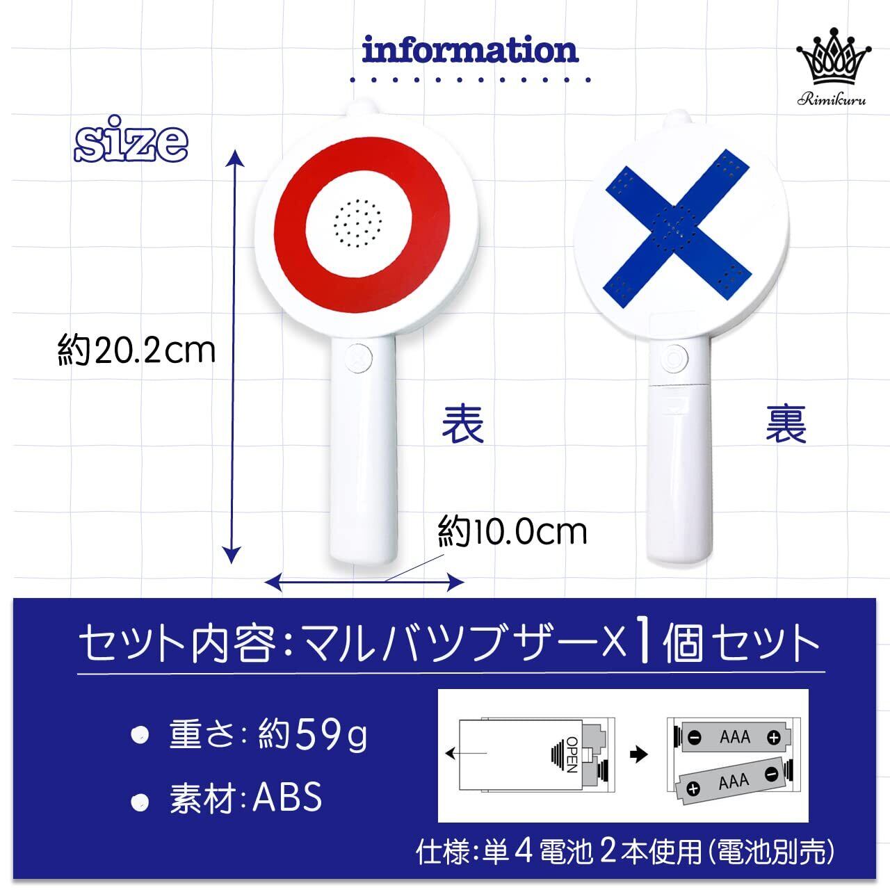 【商品仕様】セット内容:マルバツブザー ×1個 仕様:単4電池2本使用(電池別売) サイズ:約20.2cm×約10.0cm 重さ:約59g 素材:ABS ※モニターの環境等により、色の見え方に若干差が生じる場合がございます。